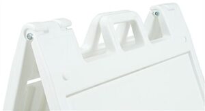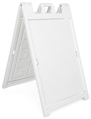 These outdoor signs are manufactured exclusively from polyethylene, a durable plastic, making them ideal for exterior use. Their durable construction ensures that the frames won’t rust or splinter over time, unlike wooden a-frames. These outdoor signs feature sleek, white coloring allowing messaging and colorful posters to stand out. These outdoor signs may be filled with sand for extra stability in windy weather. The hinges of this portable display lock and unlock for easy setup and transport. These outdoor signs feature a top handle for ease of transportation.