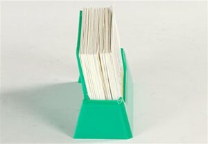 A business card holder should be able to hold a large quantity of business cards so you can increase distribution of your contact information without having to constantly refill the display up. This desktop accessory is no exception as it can hold up to 3/4″ stack of cards, or approximately 49 cards! Another great feature of this business card holder is its size. The entire unit is only 4″w, therefore taking up little desktop space. This teal business card holder, also known as a desktop card display, is an affordable tool to help promote a business and keep contact information more easily accessible.