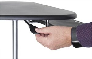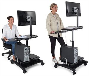 Our mobile workstation desk is a wonderfully versatile solution for hospitals, medical spaces, corporate offices, libraries, and more. The convenient height-adjustable design allows you to switch between a sitting or standing workspace, accommodating a wide range of spaces and needs. This sit-stand mobile workstation desk can hold computer monitors up to 27″ and has tilting and swiveling functions, providing you with the perfect viewing angle. Attached to the keyboard shelf are a retractable mouse tray and a cup holder for added convenience. This rolling computer counter also features locking caster wheels, which allow for stability and mobility. Additionally, the fixed shelves at the base of this sit-stand workspace can hold a CPU tower, printer, or office storage, letting you conduct business all from one spot. A flexible plastic tube for cable management is also included to keep wires organized and out of sight. Each unit is made of high-impact ABS plastic and aluminum, offering durable support for your monitor, printer, and other electronic or office items. This height-adjustable mobile workstation desk with a convenient rolling design perfectly suits doctors, nurses, professors, and corporate professionals looking for versatility and portability throughout the work week!