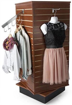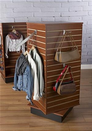 Slatwall Cube Fixture for Floor, 4 Sides, Rotating, Base Wheels – Cherry