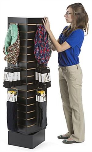 This spinning slatwall stand is a beautiful fixture for highlighting a variety of products and accessories in any retail store. Built with durable MDF wood and laminated in a matte finish, these floor standing displays are designed to withstand daily wear and tear as customers interact with the unit. With 15 panels on 4 sides, there is plenty of space on each black slatwall stand to exhibit a wide range of merchandise. The channels on this floor fixture are compatible with standard size accessories, from acrylic sign holders to clothing racks. Rotating a full 360°, customers will be able to easily access every side of these black displays. For an attractive showcase that will appeal to your customers, try this slatwall stand in your retail store!