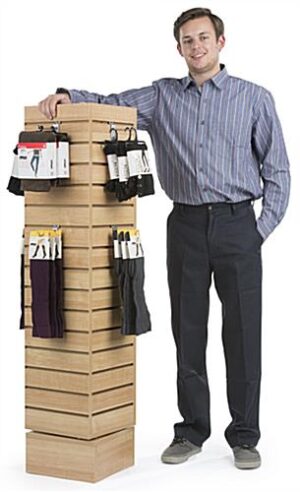 This rotating slatwall gondola is the perfect stand for showcasing a variety of products while saving valuable floor space. Freestanding on a sturdy base, these display fixtures spin a full 360° for customers to explore items for sale. A variety of clothing racks and acrylic accessories easily hook into the 15 channels per side on this maple slatwall gondola. These 4-sided display fixtures are made with durable MDF wood, while the laminate finish adds an upscale look for an attractive freestanding showcase. At 54” tall, each retail unit stands out in any setting while spinning on the base, ensuring that items on waterfall racks or sign holders will be seen. The slatwall gondola ships fully assembled for immediate use in your store!