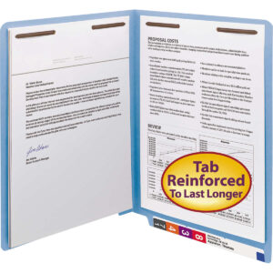 Two fasteners per folder provide two separate filing surfaces for attorneys, bankers or sales people to keep meeting notes on one side and written drafts on the other. Perfect for coding insurance folders by policy type. Straight cut tabs have plenty of room for numeric, alphabetic and bar coded labels. Holds up to 3/4″ of material.