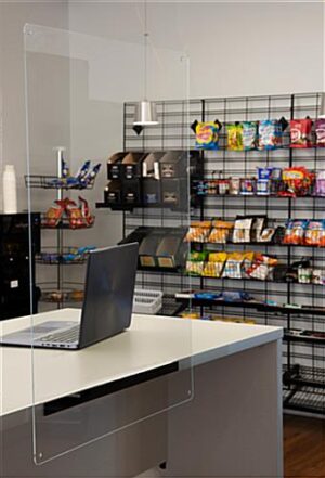 This hanging acrylic sneeze guard is perfect for cashiers in convenience stores, markets, retail shops, or banks to help keep a healthy social distance. This clear protective guard allows for everyday business transactions to occur with an added layer of safety. Each 23″ x 31″ hanging acrylic sneeze guard allows for many different placement styles. The four drill holes in the corners allow you to hang this piece from the ceiling with hardware or fasten it to a flat surface. Industrial strength hook and loop strips are also included as another mounting option for this protective guard. This hanging acrylic sneeze guard is a great way to protect your cashiers and customers while also helping enforce social distancing guidelines in your store.
