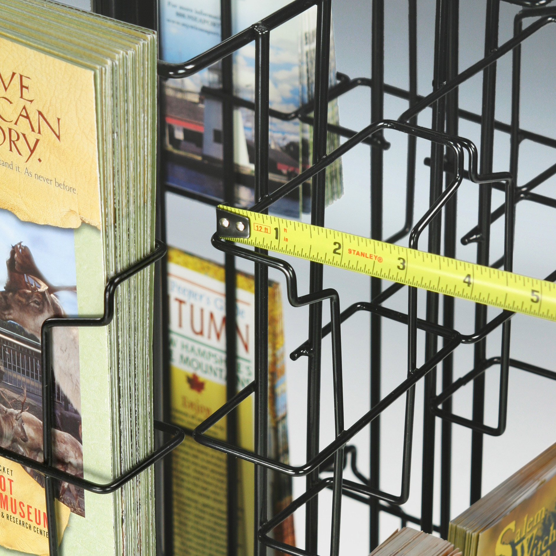This countertop display is ideal for keeping your brochures neatly organized! The countertop display is fabricated from durable wire with a black gloss finish and a plastic base. This countertop display is intended for desktops and other high-traffic areas. This brochure rack is also great for counters with limited space. Our countertop display features 16 pockets. Each side of this display contains four pockets for standard 4″w x 9″h brochures. This countertop display is commonly seen in hotels, museums, travel agencies, attraction landmarks, and information counters. We include a sign clip holder with this countertop display for showcasing additional messages or a printed advertisement. Use our countertop rack to add visibility and draw attention to your brochures today!