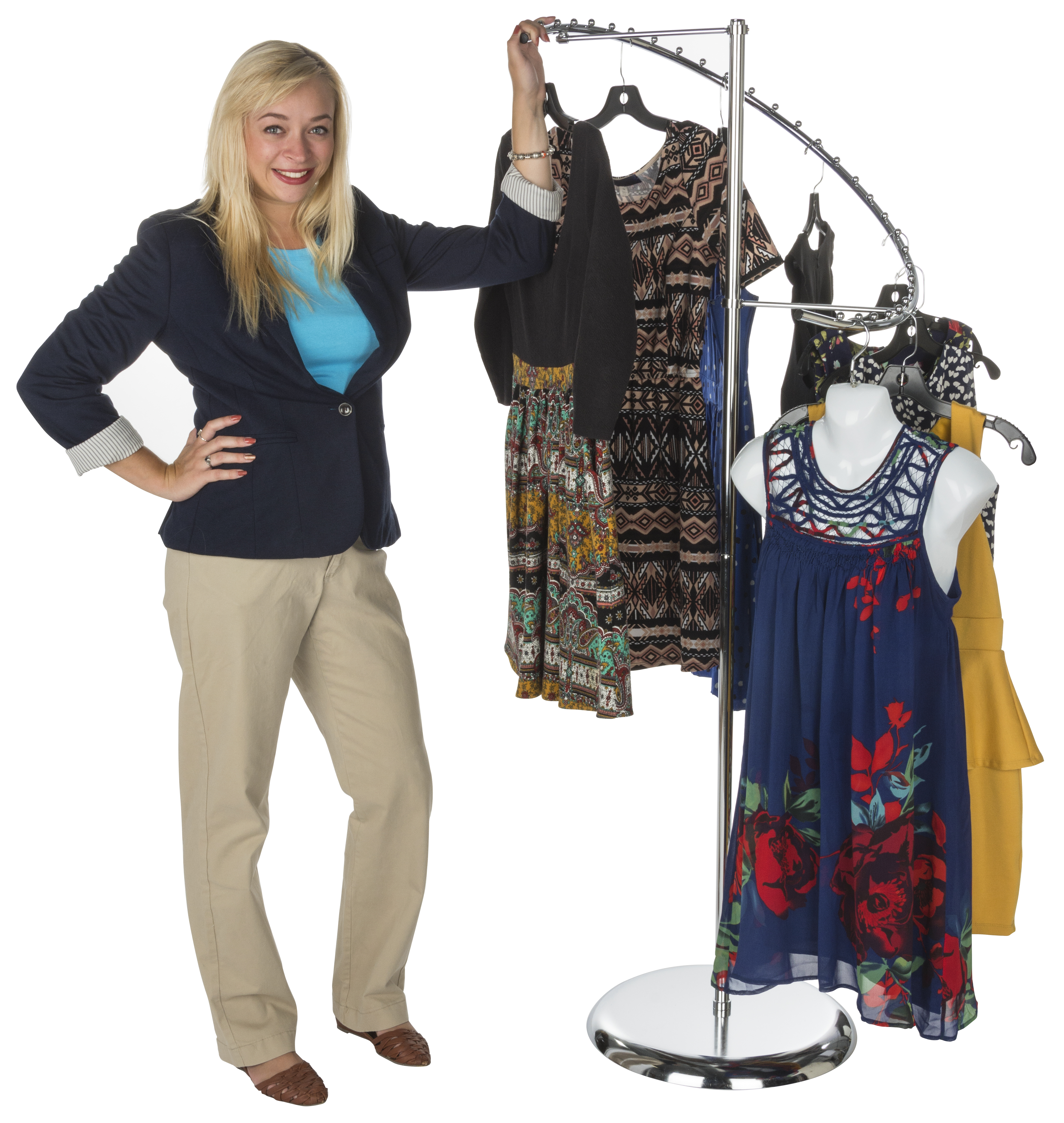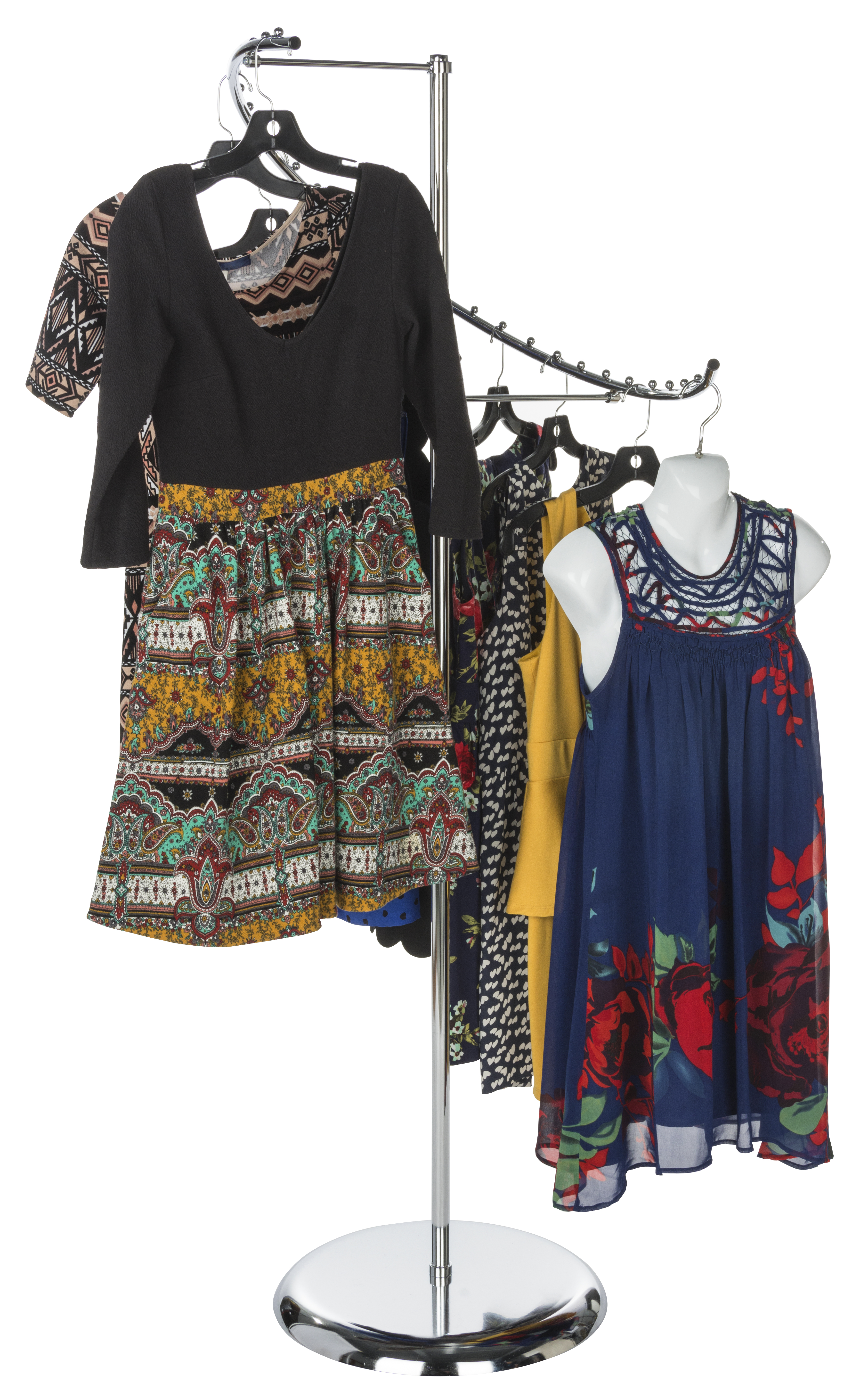 This spiral clothing rack is a metal store fixture that displays garments for any retail shop. The coiled chrome arm features 29 balls to keep garments separated and organized for a clean look. A metal clothing rack saves floor space, therefore creating a structured and professional retail environment. The chrome store fixture offers a simple shopping experience for customers. This clothing rack features a circular weighted base which provides stability and helps accommodates heavier apparel. Create a professional and organized environment with this unique circular stand.