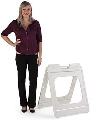 This square a frame sign is an adaptable sidewalk promotion tool for any type of business and outdoor event! With a quick change design to easily slide 2 poster boards in, this double sided unit provides ease of use.. The white a frame sign holds 24” x 24” graphics for a unique size that ensures that your advertisements will be seen. A built-in handle lets you transport this portable unit to set up on the sidewalk or a trade show. To keep this outdoor display steady, each unit has non-slip feet and a base that can be filled with up to 6lbs of sand. When you’re done for the day, the quick change insert lets you remove posters with ease and, if you buy multiple units, stacking lugs keep them securely piled together for convenient storage. For a portable yet sturdy display, add this a frame sign to reach more potential customers!