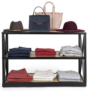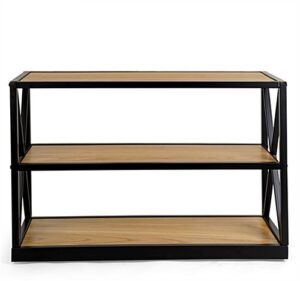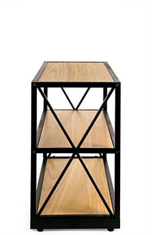 This French industrial console shelf has a steel frame and solid Paulownia wood boards that exude rustic charm and sophistication. A farmhouse-inspired look built from modern materials gives this bookcase a vintage aesthetic, without you having to worry about fragile, aging pieces and parts. This industrial console shelf with open storage makes for an inviting product fixture in retail settings or eye-catching décor display in cafés and restaurants. The three natural-finish tiers are equally suited for use as a bookcase in your home or creating just the right rustic aesthetic in your business. At just over two feet high, this console shelf also makes a great accent piece or entertainment center. Bring a modern farmhouse look to your space with this wood and metal fixture.