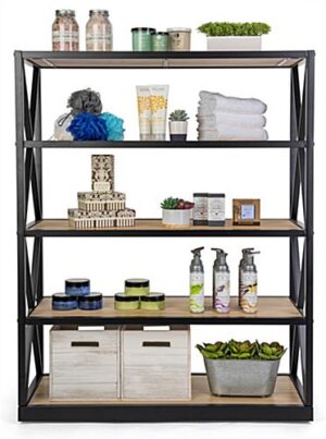 These engineers industrial bookcase shelves use a combination of solid wood and powder coated steel to create an upscale, yet rustic design with modern sensibilities. Clean lines and open backed tiers make for an inviting retail display or curio stand. These industrial bookcase shelves with steel framing are 14” deep and just over 37” wide, providing plenty of space to stow glassware, kitchen utensils, and more. Crafted with a modern touch, this fixture has attached floor levelers for sturdy placement. The natural wood finish makes any space feel warm and inviting and provides the finishing touch on a farmhouse aesthetic. These bookcase shelves are an eye-catching fixture, whether used for a retail display, a décor piece in a café, or as a charming rustic storage piece in your home.