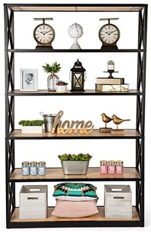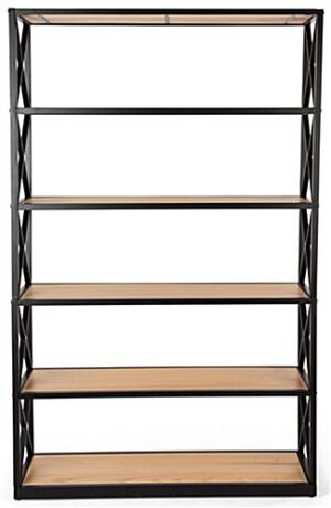 Steel Frame X-Sided Shelving Unit with 6 Solid Wood Tiers, Open Back – Natural