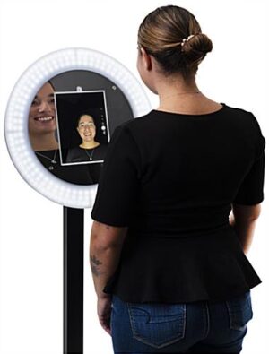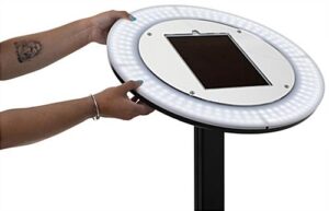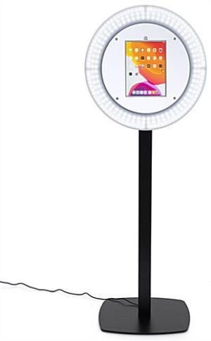 This tablet photo booth stand with an illuminated ring light takes high-quality pictures and videos, perfect for media influencers, cooking blogs, and online makeup tutorials. Our display has a weighted metal base to ensure stability in high traffic areas. The LED-lit tablet photo booth stand has a 180-degree tiltable ring light and height-adjustable pole ranging from 55″ – 70″ to capture the perfect angle. This lightweight, portable fixture requires minimal assembly and is quick to set-up, excellent when traveling to events. Our iPad 10.2 illuminated ring light has a setting on the back that allows you to change the color temperature from cool 5600K to a warm 3200K within seconds to capture ideal lighting. The sleek and modern design has hidden cable management, creating a professional display no matter the event type. To ensure that your iPad 10.2 is protected, the anti-theft tablet enclosure is reinforced with security screws for complete theft-prevention at any outings. Use this illuminated iPad selfie photo booth stand to enhance customer traction and create a fun, memorable environment.