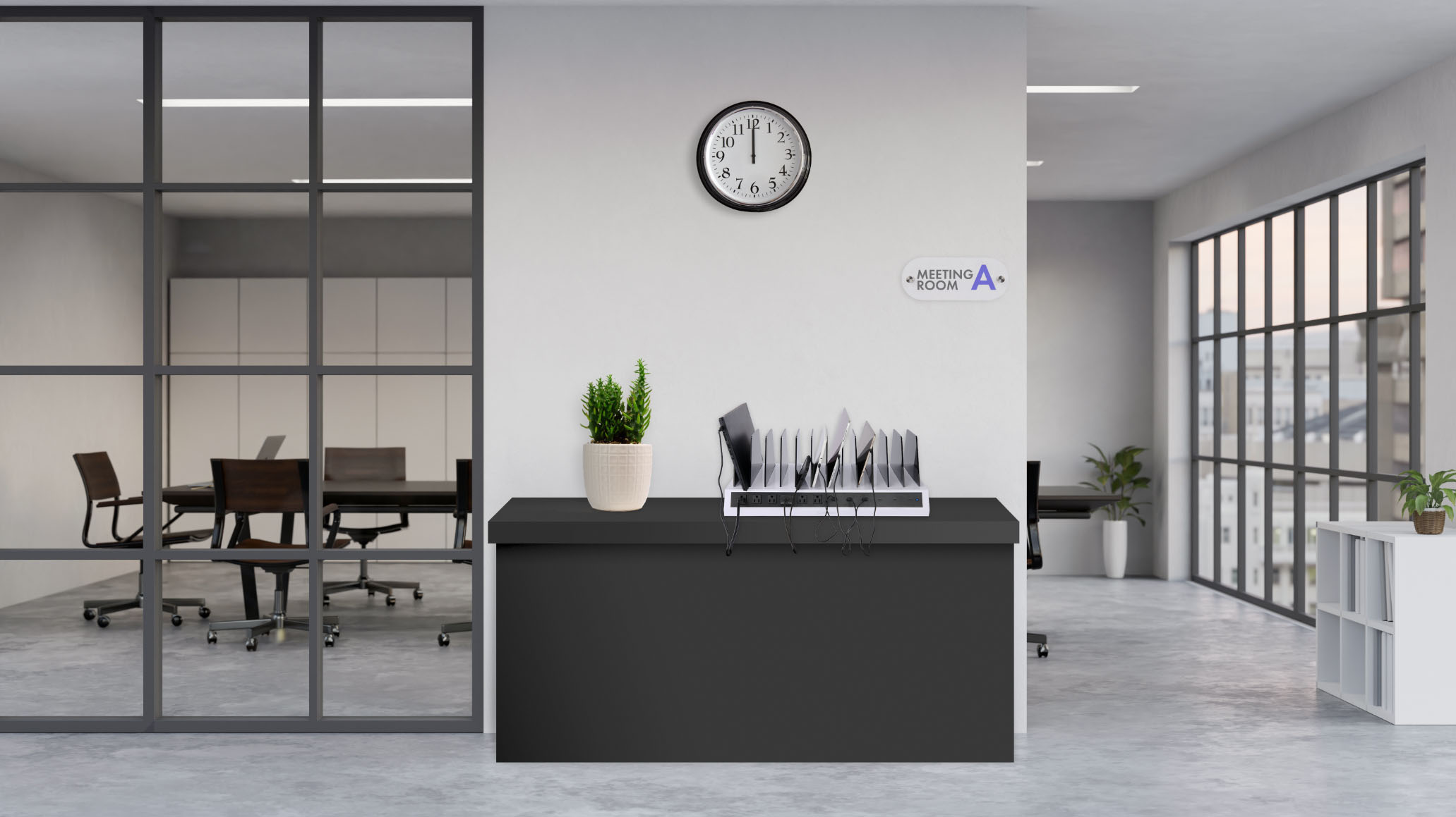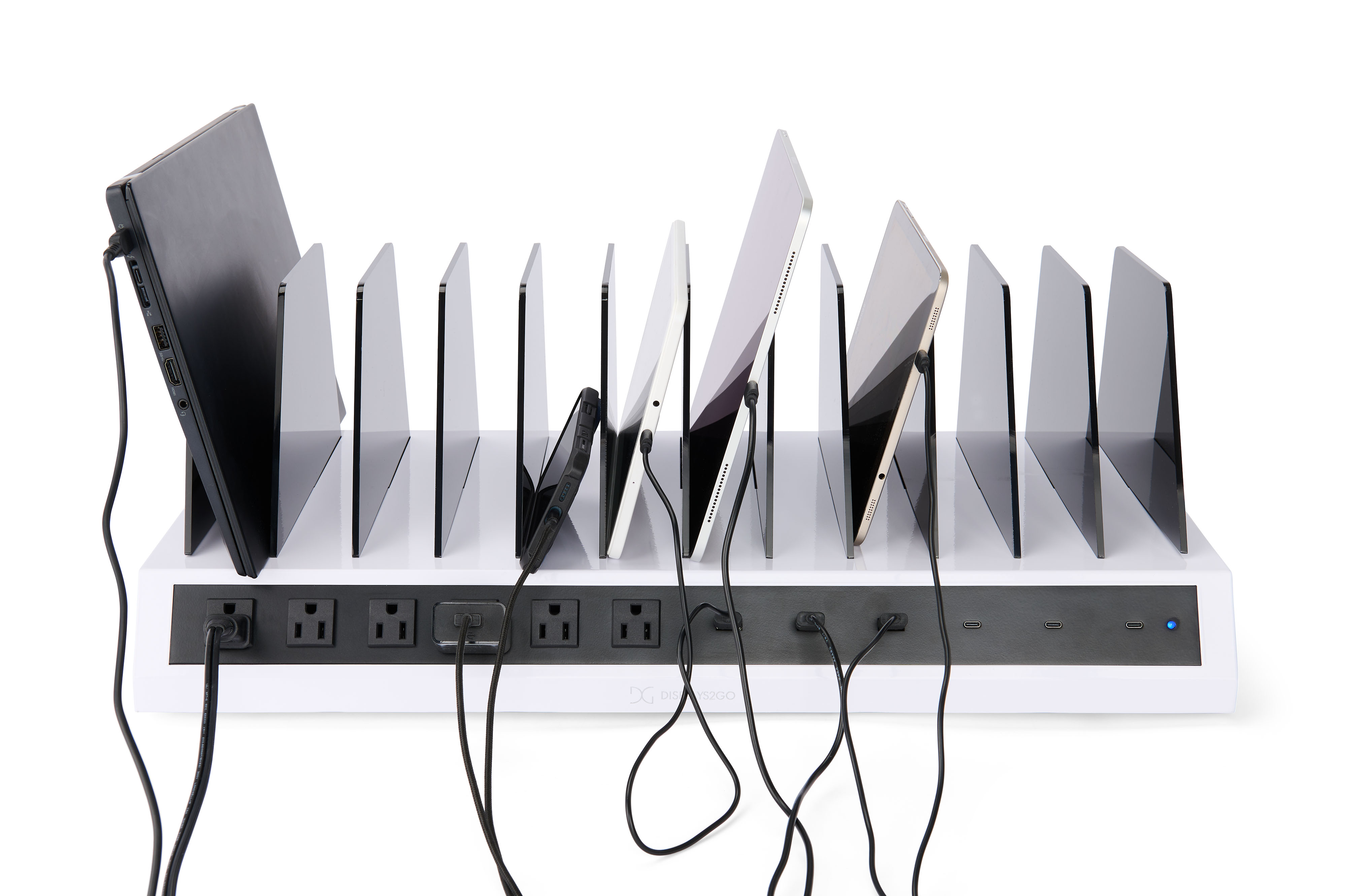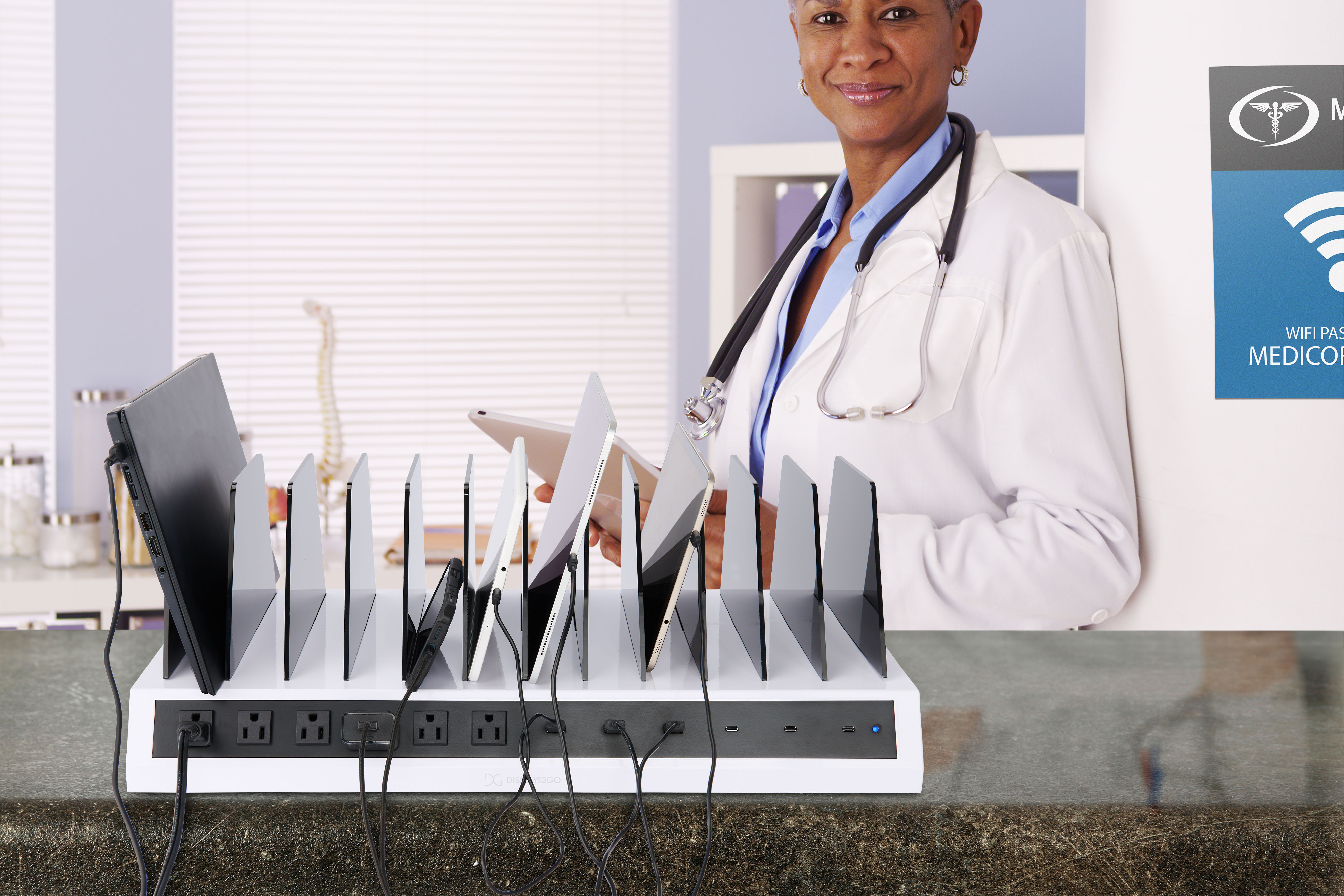 This tabletop charging station is perfect for any conference room, medical practice, or classroom with multiple devices to power. The counter unit has an open design conducive to servicing devices of various sizes, such as laptops, mobile phones, and tablets, perfect for guests and staff. It features 6 -AC, 3 -USB-A, and 3 USB-C outlets with USB fast charging protocols. This charging station also has removable acrylic dividers that allow more oversized items to fit vertically or horizontally. With overall dimensions of 24″L x 12″W x 8.77″H and dividers that help to keep the devices neat and organized, this unit is the perfect way to power electronics while eliminating countertop clutter. The sturdy unit weighs 18 pounds and requires minimal assembly. This stable tabletop charging station is perfect for any medical practice, office, or classroom looking for an organized solution to restore power to multiple devices.