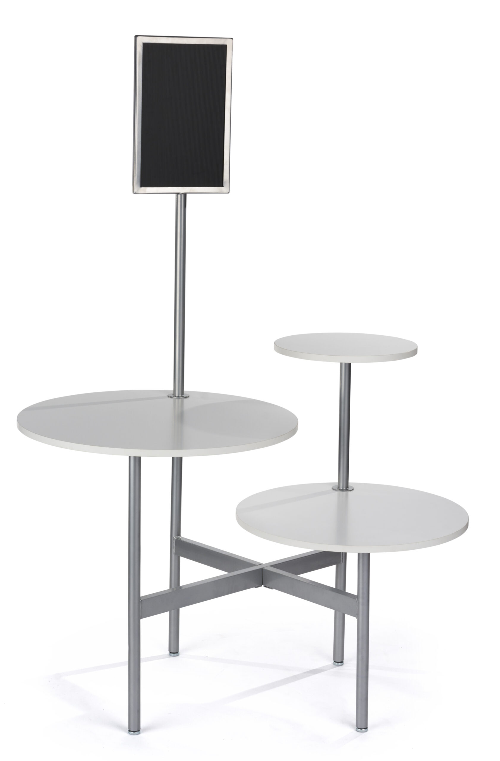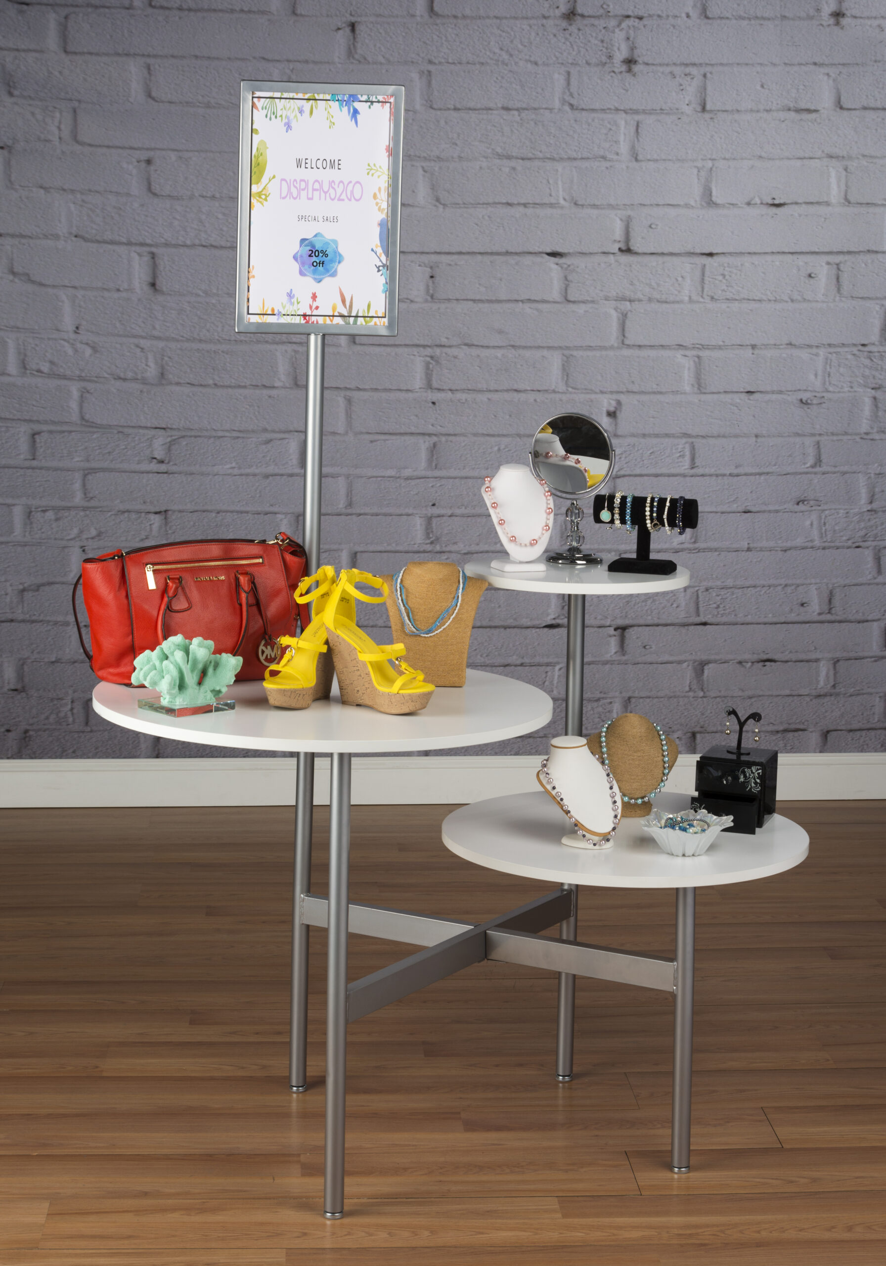 Tiered Display Table w/ 3 Shelves, Round, 11 x 17 Sign Frame – White