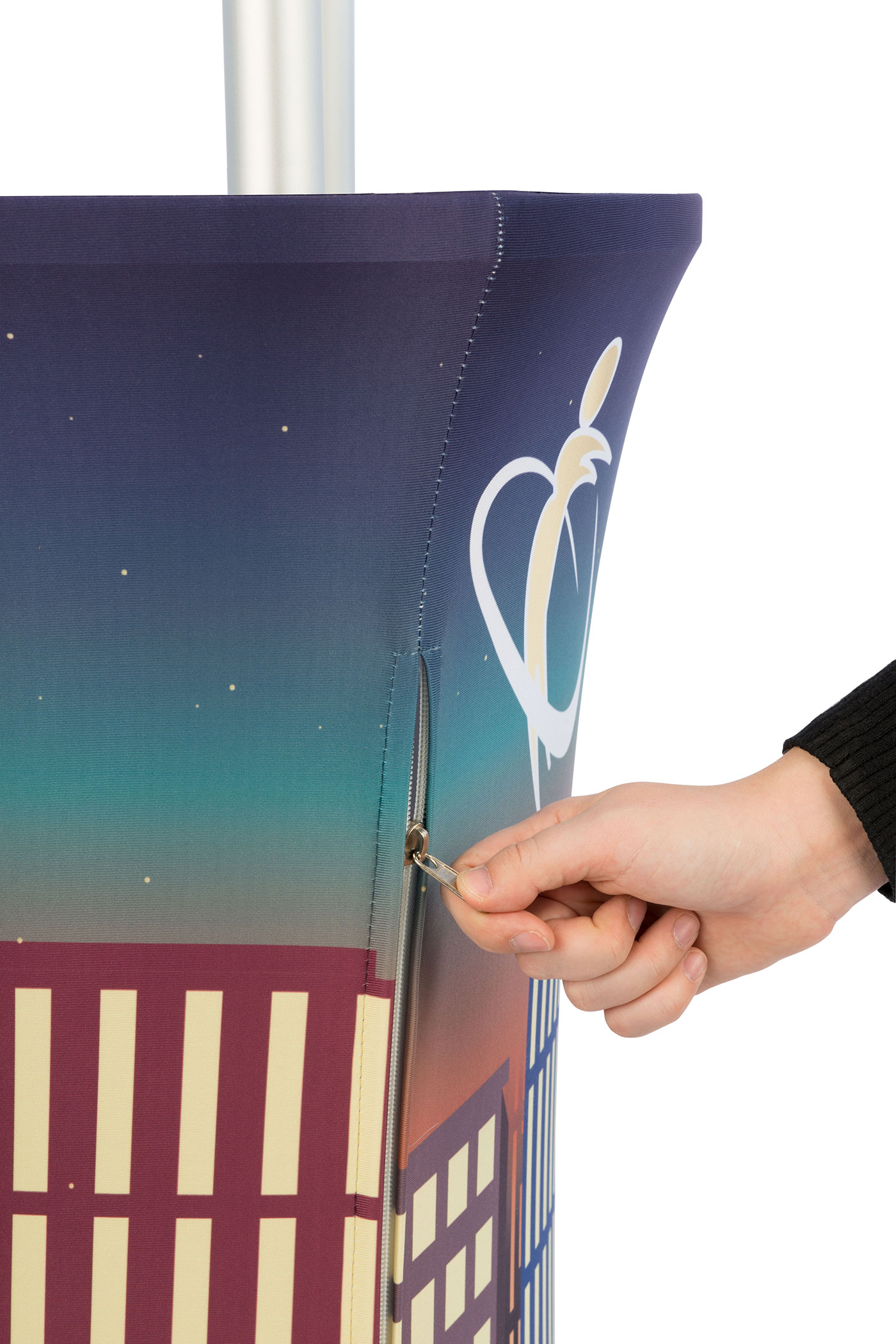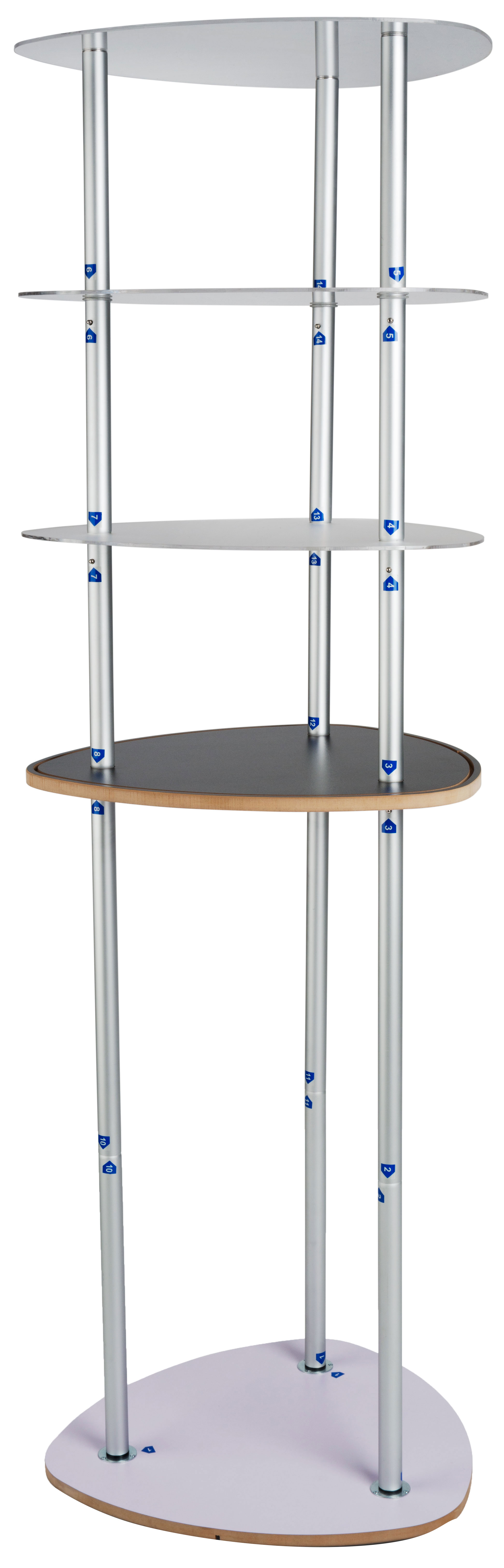 This promotion graphic tower display enhances any trade show or event with dye-sublimated printed fabric and 3 acrylic shelves to showcase products and goods. Standing at over 6’, these portable exhibition counters uses height over width to save valuable booth space while attracting attention even in large crowds. With labeled poles and a push-and-click design, the aluminum tower display is easy to assemble and includes all necessary hardware, including a pair of soft cotton gloves to minimize fingerprint marks while handling. The printed artwork stretches from the bottom of the unit and extends to a channel built into the top of each of the counters. Simply push the silicone edge into the groove to secure in place and create an attractive taut look. While many portable exhibition stands have one surface to merchandise goods and distribute literature, this unit implements 3 high-impact acrylic shelves that can support up to 33 lbs. each and will resist damage during travel to the next event. When the show is over, simply pack the tower display in the included carrying bags for easy portability from one location to the next.