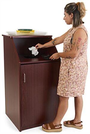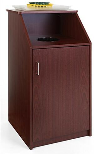 This top drop waste receptacle has a circle opening, which makes throwing away trash more convenient while stopping refuse from falling along the sides of the bin, perfect in restaurants, food courts, and cafeterias. The sleek mahogany garbage bin features a smooth melamine finish that protects against kitchen heat, moisture, staining, and more, making it easier to clean at the end of the day. Our USA-made top drop waste receptacle with a circle opening holds a 36 gallon liner that can easily be replaced by using the front hinged door. This heavy-duty garbage bin is made of 18mm thick particle board, ensuring durable performance for years to come. Use this USA-made restaurant trash barrel to hide liners, and keep a clean appearance at chain eateries, malls, food courts, and more. This mahogany top drop waste receptacle ships with all the necessary hardware, making the assembly process quick and effortless, even in a busy restaurant.