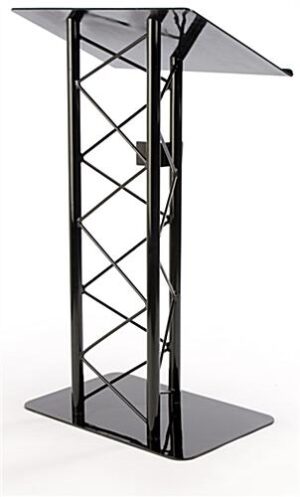 A podium, also known as a presentation lectern or floor lectern, has a powder coated black finish that brings a striking presence to any room it is placed in. A truss lectern, podium has a large top surface area that holds books and lecture notes quite easily. A lip on the bottom of this surface keeps your lecture material from sliding off. This floor lectern, podium uses an exciting design to draw the focus of your audience towards the speaker, ensuring all are paying attention to their presentation.