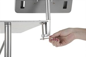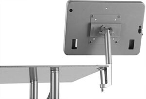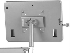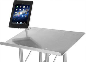 This iPad floor lectern is a leading-edge design that combines digital and print format into one stunning, interactive display! Each tablet stand is 47” tall to correspond to the average person’s upright posture for a comfortable presentation stance behind a contemporary truss design. The top of the aluminum floor lectern has a reading space of 23-1/2” for enough room to organize notes and other literature pieces into a tidy display and within accessible reach. Uniquely, this stand includes a tablet holder with purchase that has a covered home button that clamps to the edge of the podium’s tabletop which transforms it into a multimedia design. The iPad lectern is a locking enclosure to ensure that unauthorized users cannot tamper with software applications and presentations. Also, each bracket can adjust to different speakers’ preferences by tilting and rotating into suitable positions. The holder accommodates a variety of Apple® products.