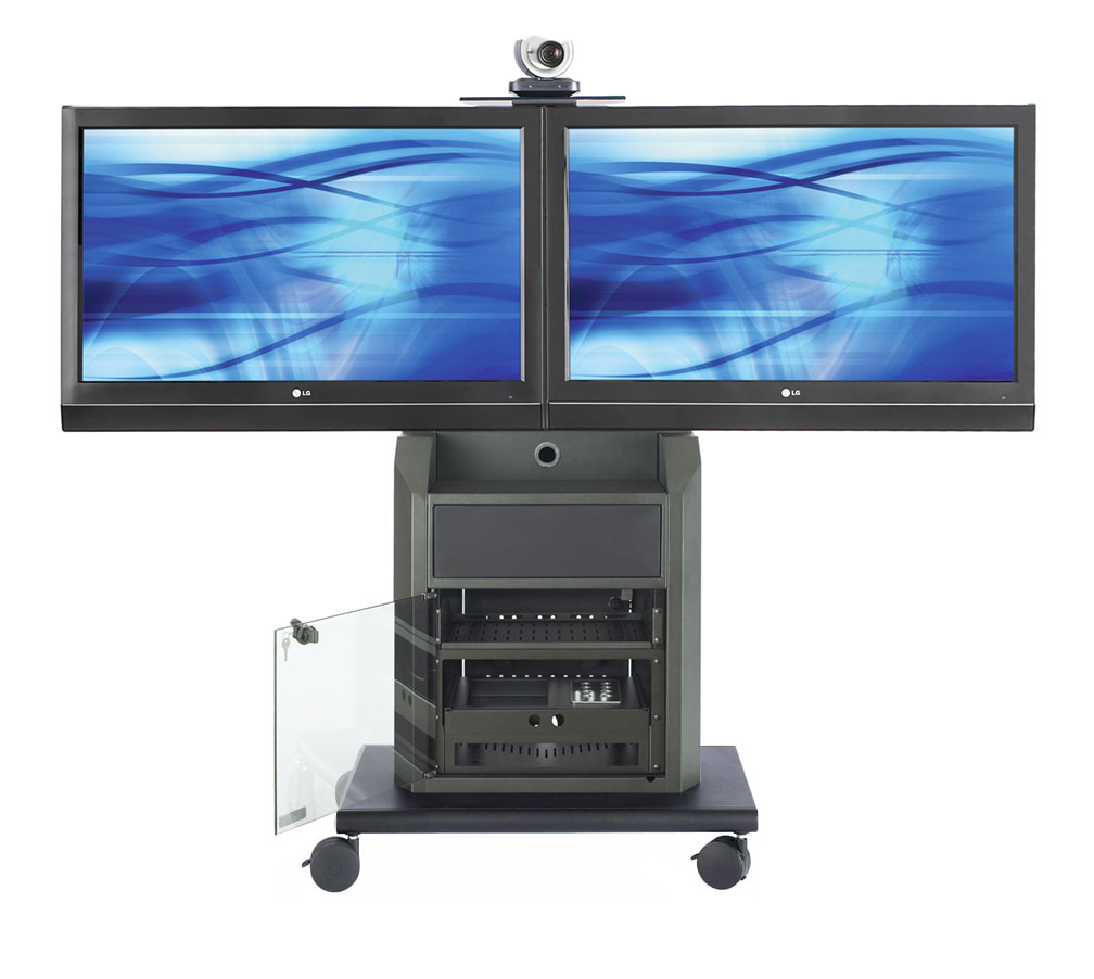 This multimedia cart that supports screens up to 55″ is highly visible even in large conference rooms. The stand has an overall load capacity of 300 lbs. and is highly durable. This mobile TV display, multimedia cart that includes rack mount storage ensures devices stay in place while moving the stand. The 5″ caster wheels glide easily over many floor surfaces even with the heavy presentation equipment installed. This multimedia cart that boasts a camera shelf is an ideal video conference stand for modern offices. Users can easily rearrange a space with this rolling trolley. Each multimedia cart is locking with a tinted tempered glass door that resists shattering. The sleek appearance is suitable for nearly any environment. This multimedia cart that is constructed of 100% solid steel is resistant to dings, chips, or other damage. These heavy duty displays can hold a laptop, cable box, internet modem and more inside the storage compartment. This video conference multimedia cart comes with a 6-outlet sure protector to safely plug in multiple devices. These deluxe carts have a smaller footprint than many mobile AV carts to preserve floor space.