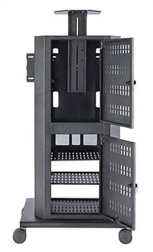 This small footprint audio visual cart, also known as an LCD holder, is equipped with a universal VESA bracket. The wheel base is only 33-1/2″w x 23-1/2″d to save space. This mobile audio visual cart is ideal for establishments who require high maneuverability of their TV presentations. Video conferencing has never been easier than with this AV equipment stand. Expensive media devices are secure in the locking cabinet. The rack rails are the standard 19″ width. By installing devices onto the rack mount, equipment stays in place even when the stand is being moved. The rear panels have 2 single gang knockouts in the case that equipment is going to be plugged directly into a wall outlet. Manufacturer model# RPS-800S.