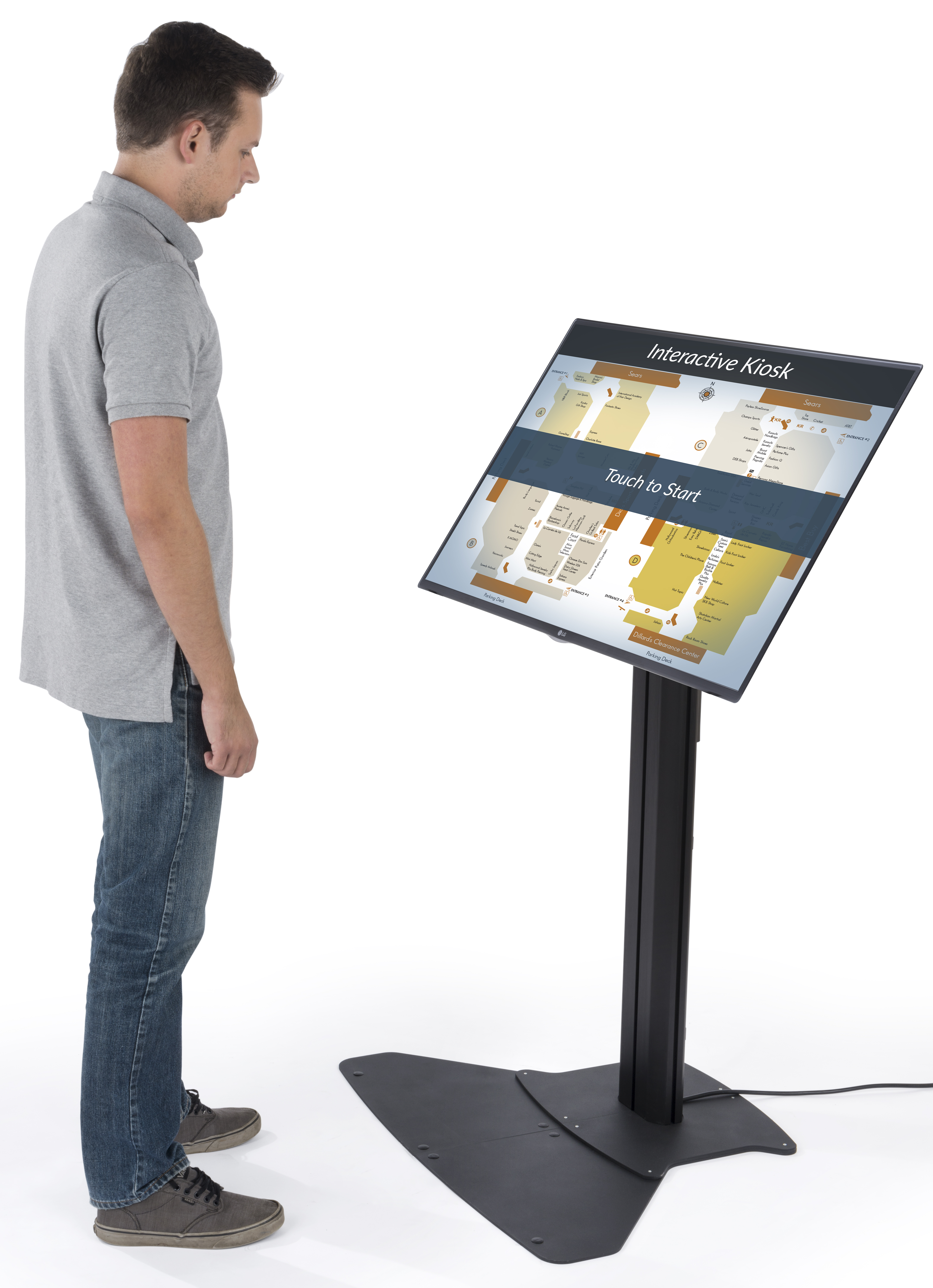 Use this low level flat screen display to immerse passersby with an interactive touch monitor kiosk. The aluminum floor stand and steel television mount is crafted for durability while sustaining a sleek and contemporary look. Each VESA compliant flat screen display includes the hardware necessary to mount most LCD, LED, and other style monitors. Featuring three tilting positions at 0°, 45°, and 90°, this floor stand can be situated for perfect viewing in any environment. Each flat screen display is capable of holding LCD monitors ranging from 32” to 55” and weighing up to 132 lbs.! Grab and hold the attention of passersby with this interactive television mount.