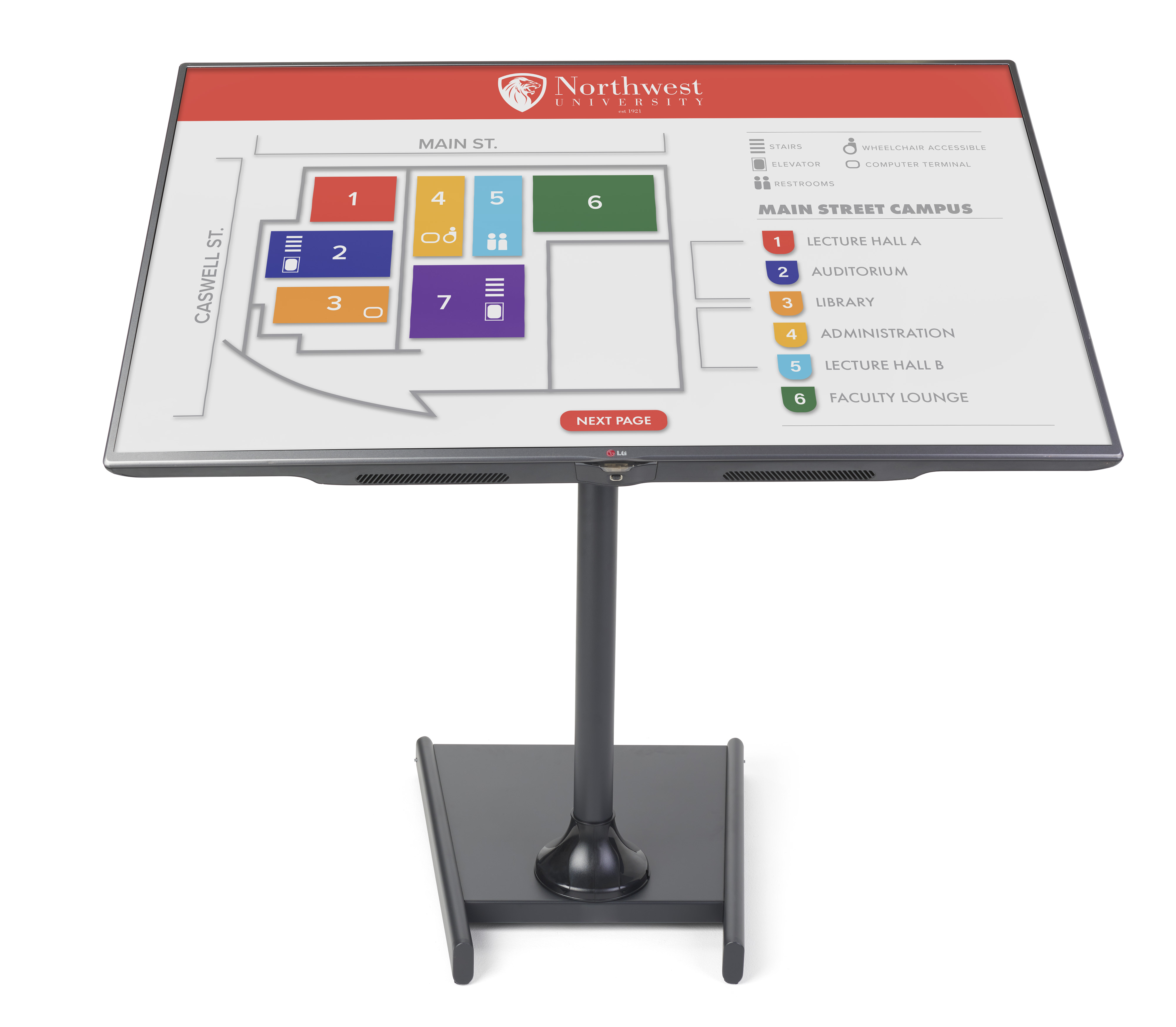 This digital lobby kiosk stand that is VESA compatible is ideal for large establishments such as an office building. This kiosk stand is height adjustable and tilt adjustable. This way finding lcd stand, digital lobby kiosk stand that holds 27″ to 60″ screens includes a mounting hardware kit. The weighted base ensures that the signage is not wobbly. This digital lobby kiosk stand that includes a tilting bracket can be used in malls, hospitals, large office buildings and more to provide information on locations. This office building signage is an affordable solution to providing a wayfinding display. This digital lobby kiosk stand has two wheels so users can tilt and roll where desired. This guiding signage for an office building holds a flat screen television that is 27″ to 60″ in size weighing less than 77 lbs. This digital lobby kiosk stand is a cost effective solution to directional displays. This LCD signage is equipped with a VESA bracket which is designed to fit most flat screens mounting options.