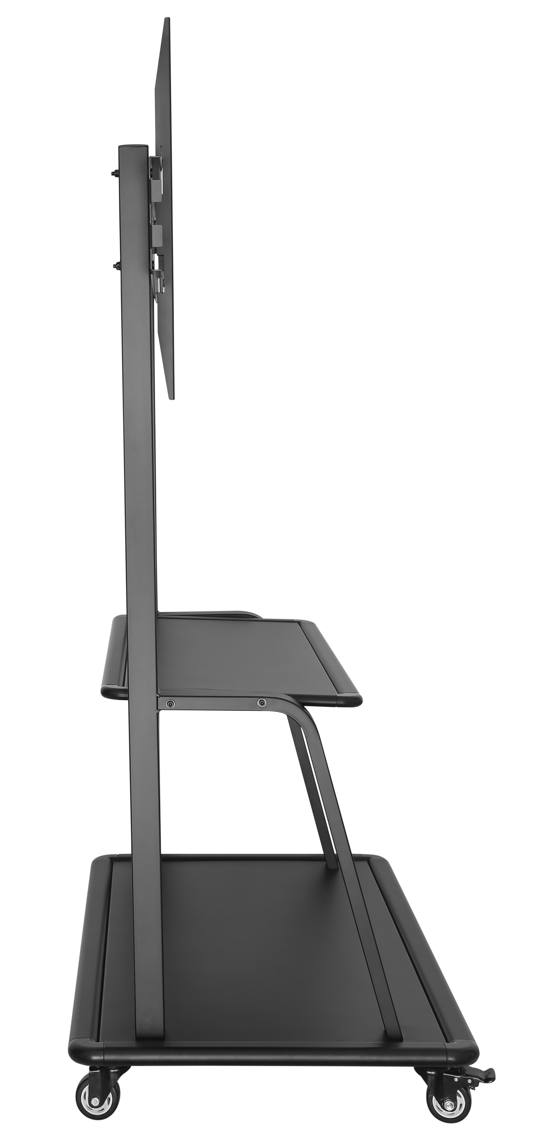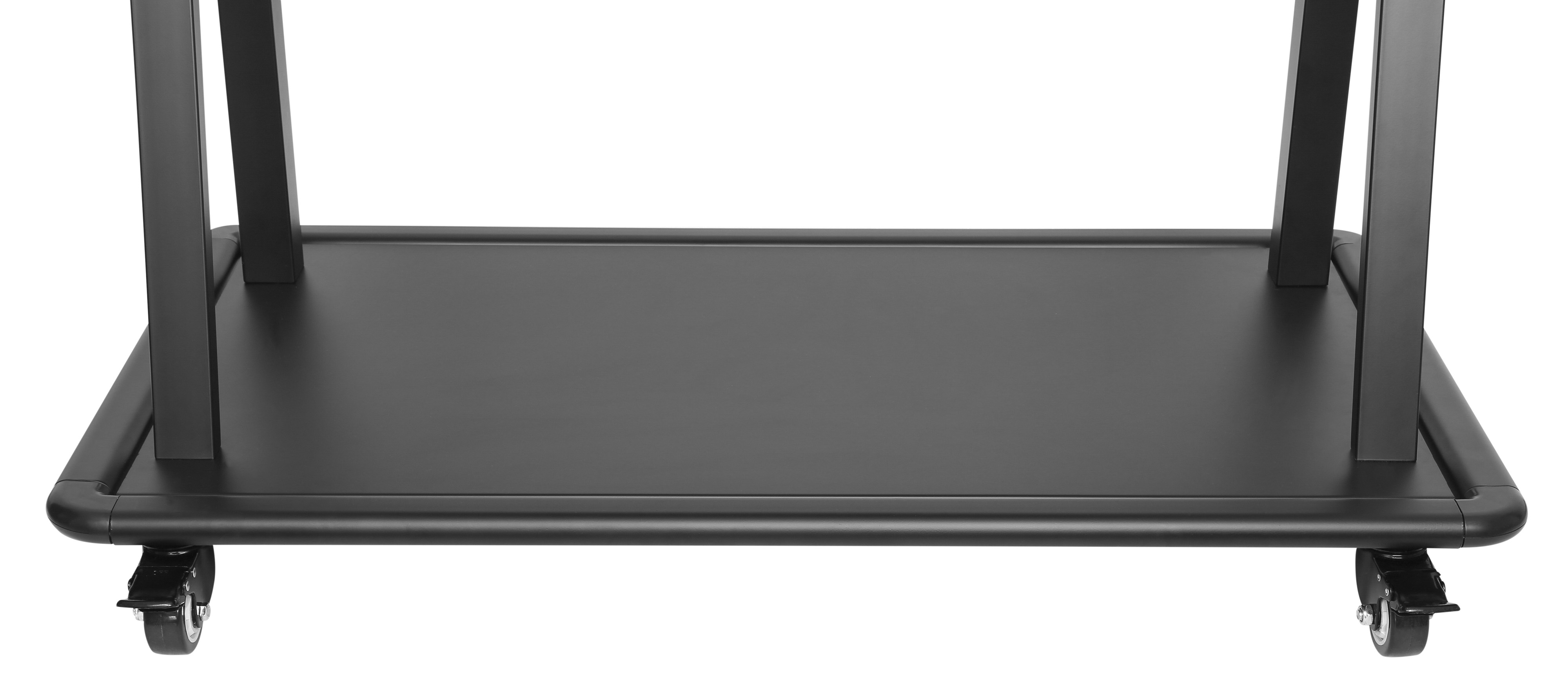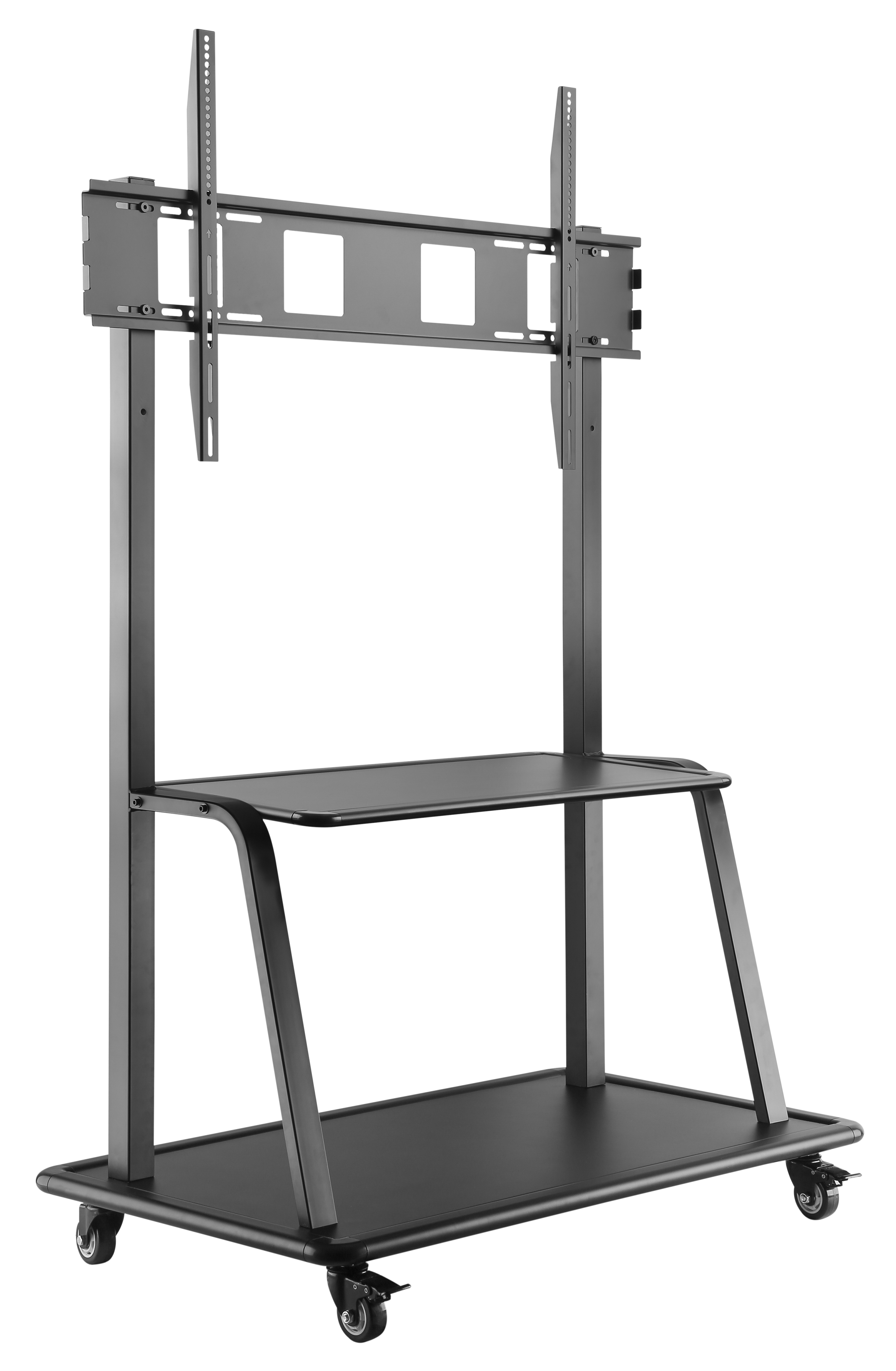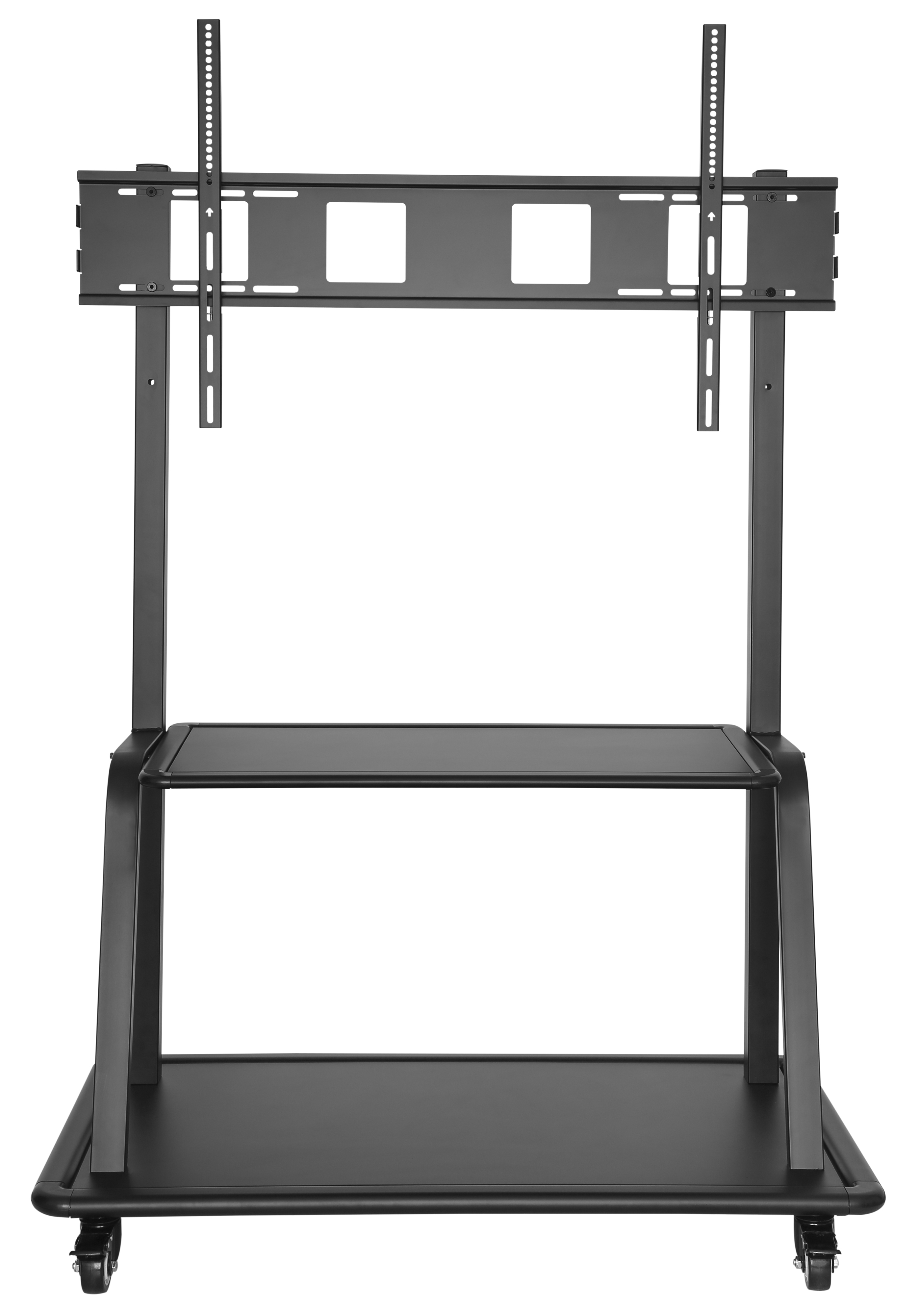 This contemporary mobile TV mount features an ultra heavy-duty steel construction with a sleek black powder-coated finish, adding a modern touch to your office, school, library, church, and more. To achieve the optimal viewing angle for your workspace, you can quickly adjust the height of this durable monitor stand between 66.9″ and 72.8″. This steel contemporary mobile TV mount offers four heavy-duty locking wheels, excellent for high-traffic areas such as trade shows, conferences, exhibitions, and more. The floor standing monitor cart has a durable base to withstand larger screens between 60″ and 105″ that weigh up to 330 lbs. for presentations in bigger settings. Our adjustable height station with wheels offers two AV shelves for keeping school or work supplies, laptops, and other devices organized and readily available during the day. This portable cart is ideal for establishments that want a versatile display that can be used in different areas of a room or building. Use our black contemporary mobile TV mount with AV shelving to enhance your marketing efforts in lobbies, trade shows, and more or for presenting at work or school.