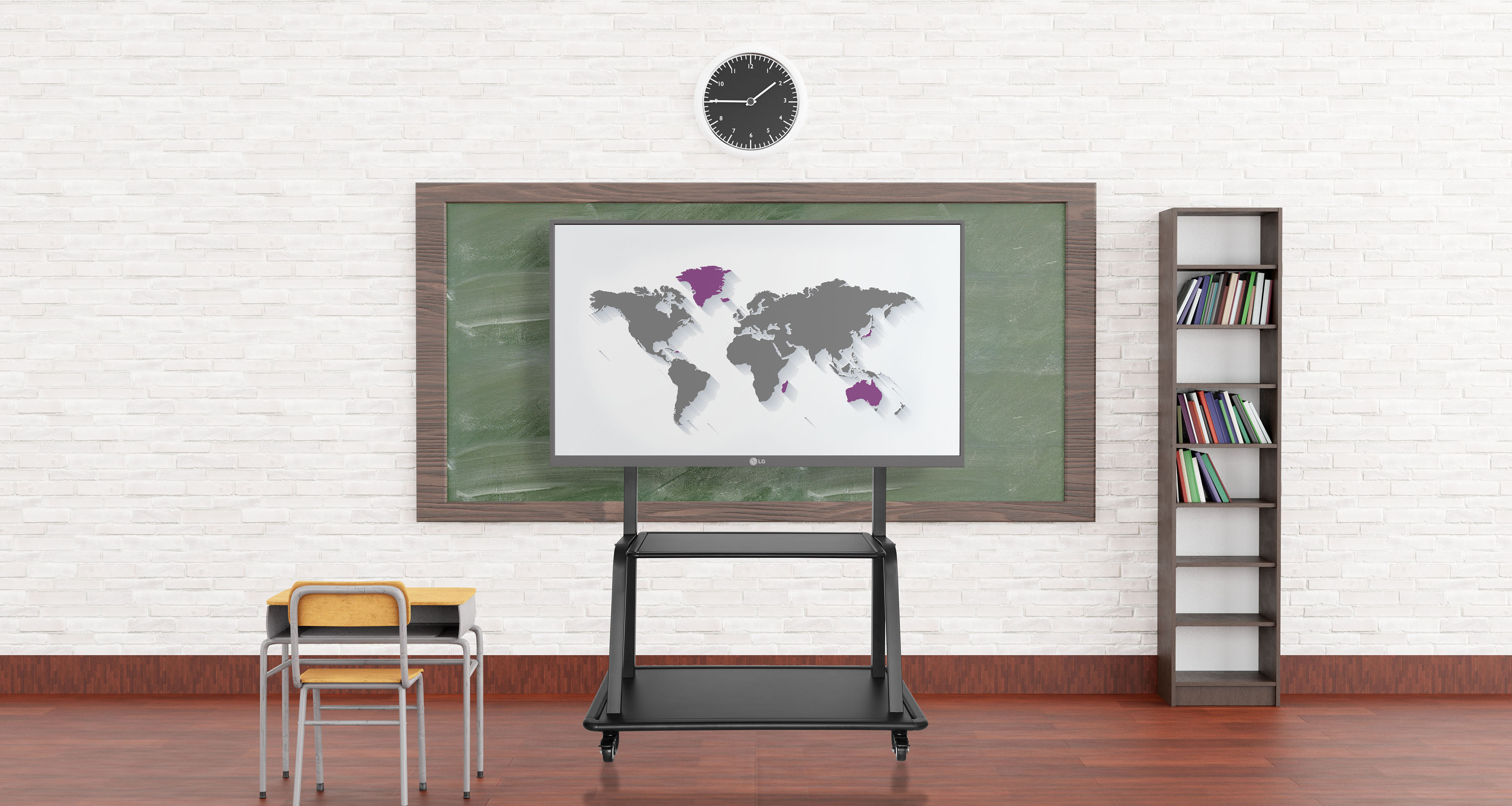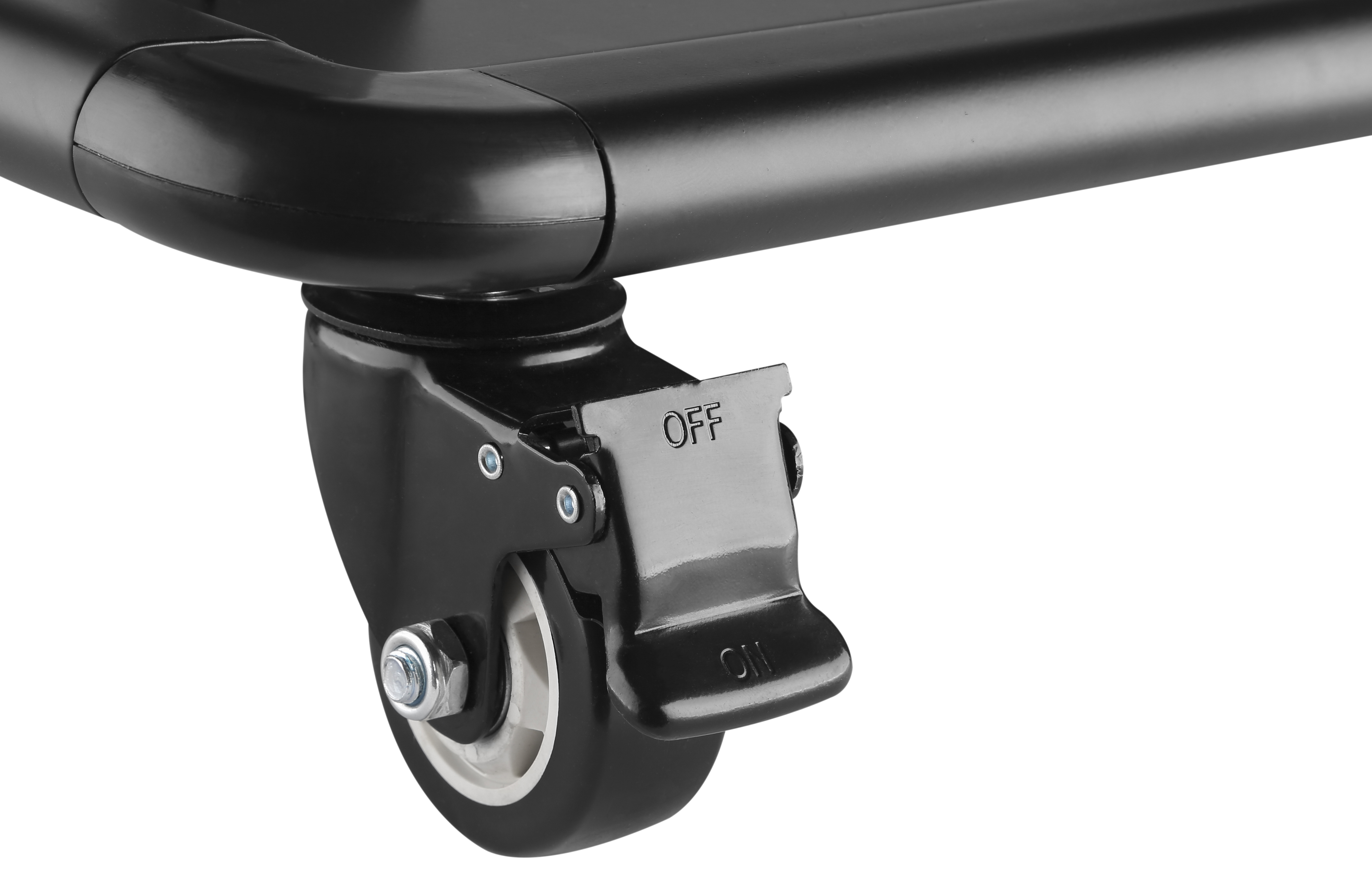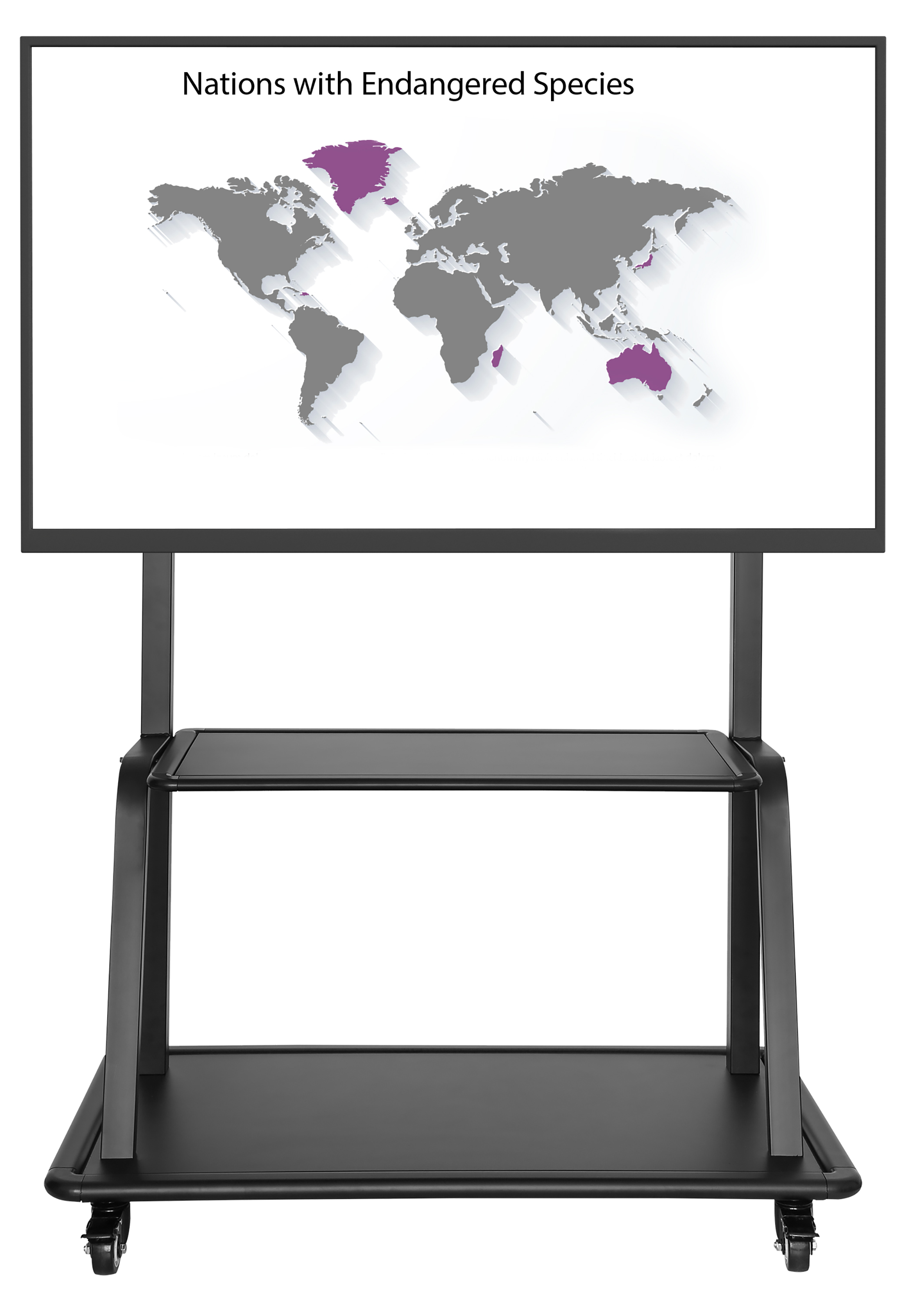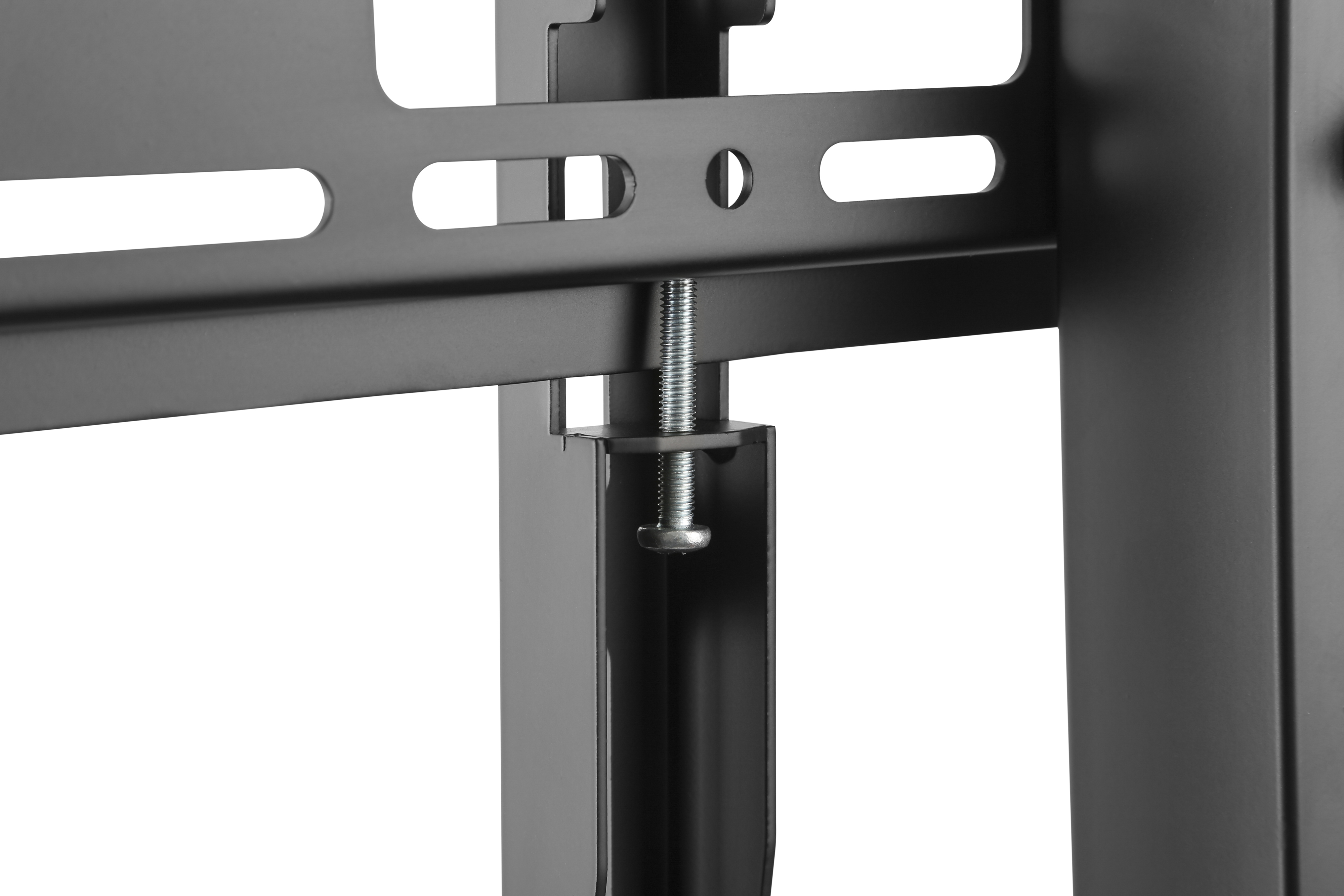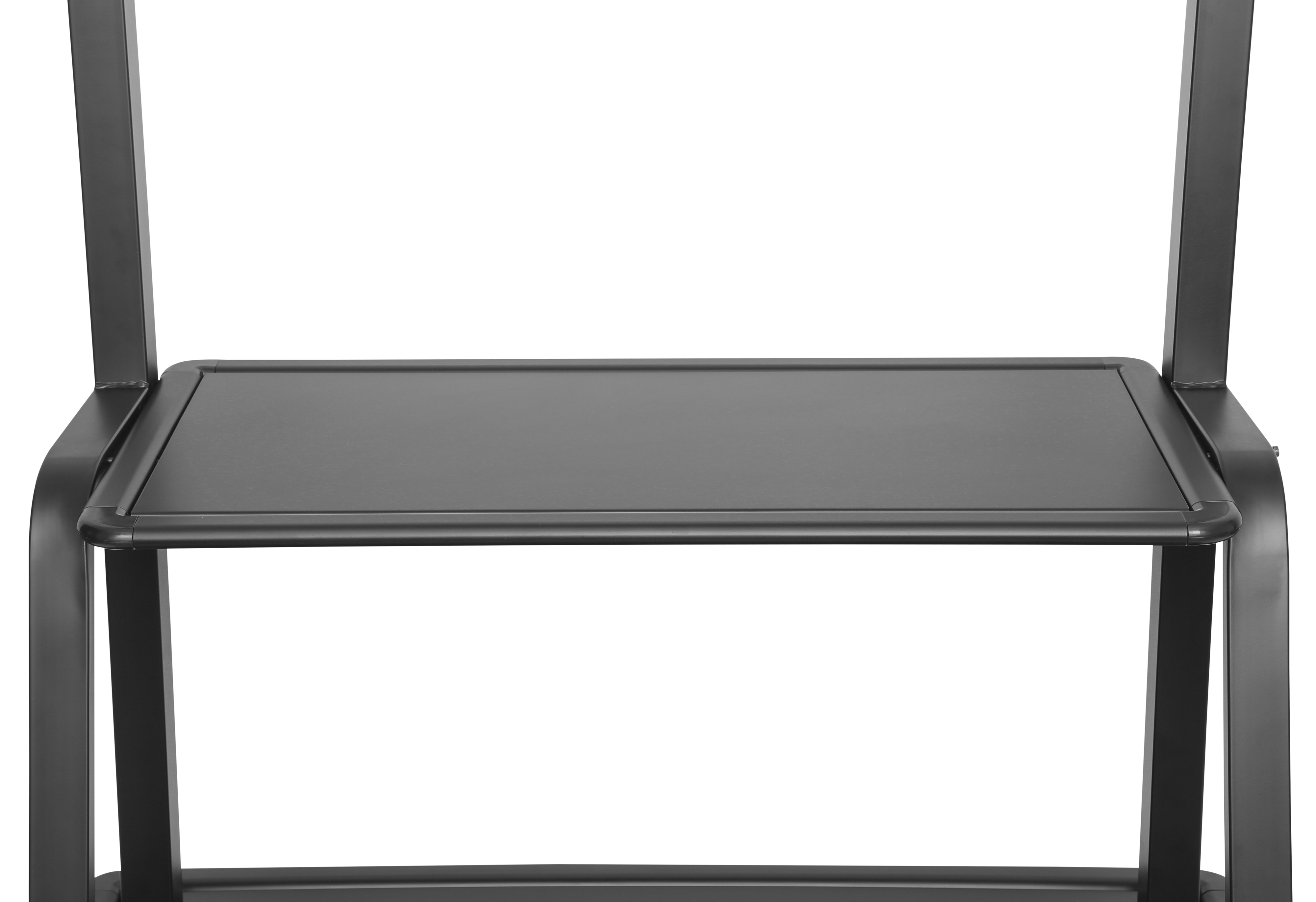 This contemporary mobile TV mount features an ultra heavy-duty steel construction with a sleek black powder-coated finish, adding a modern touch to your office, school, library, church, and more. To achieve the optimal viewing angle for your workspace, you can quickly adjust the height of this durable monitor stand between 66.9″ and 72.8″. This steel contemporary mobile TV mount offers four heavy-duty locking wheels, excellent for high-traffic areas such as trade shows, conferences, exhibitions, and more. The floor standing monitor cart has a durable base to withstand larger screens between 60″ and 105″ that weigh up to 330 lbs. for presentations in bigger settings. Our adjustable height station with wheels offers two AV shelves for keeping school or work supplies, laptops, and other devices organized and readily available during the day. This portable cart is ideal for establishments that want a versatile display that can be used in different areas of a room or building. Use our black contemporary mobile TV mount with AV shelving to enhance your marketing efforts in lobbies, trade shows, and more or for presenting at work or school.
