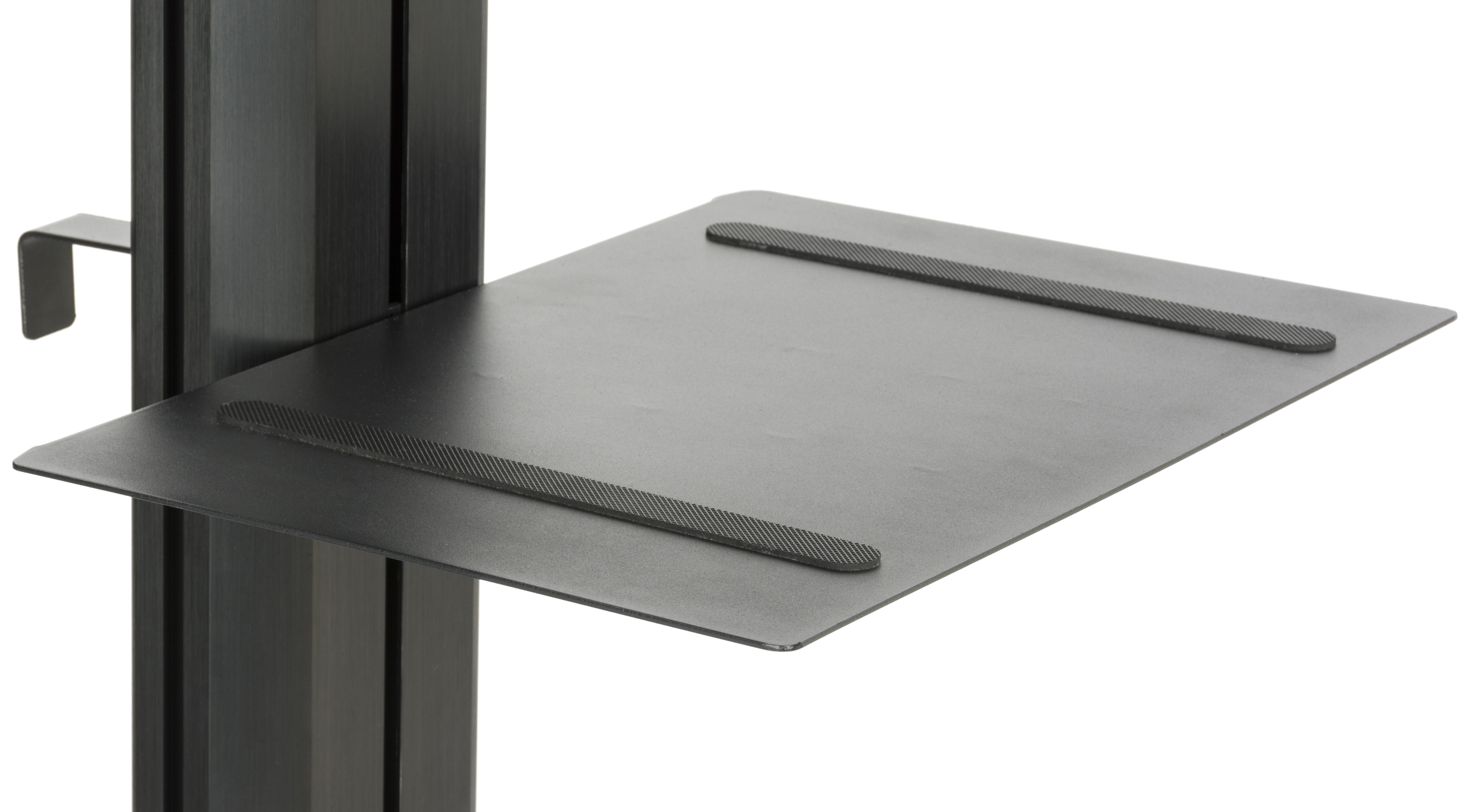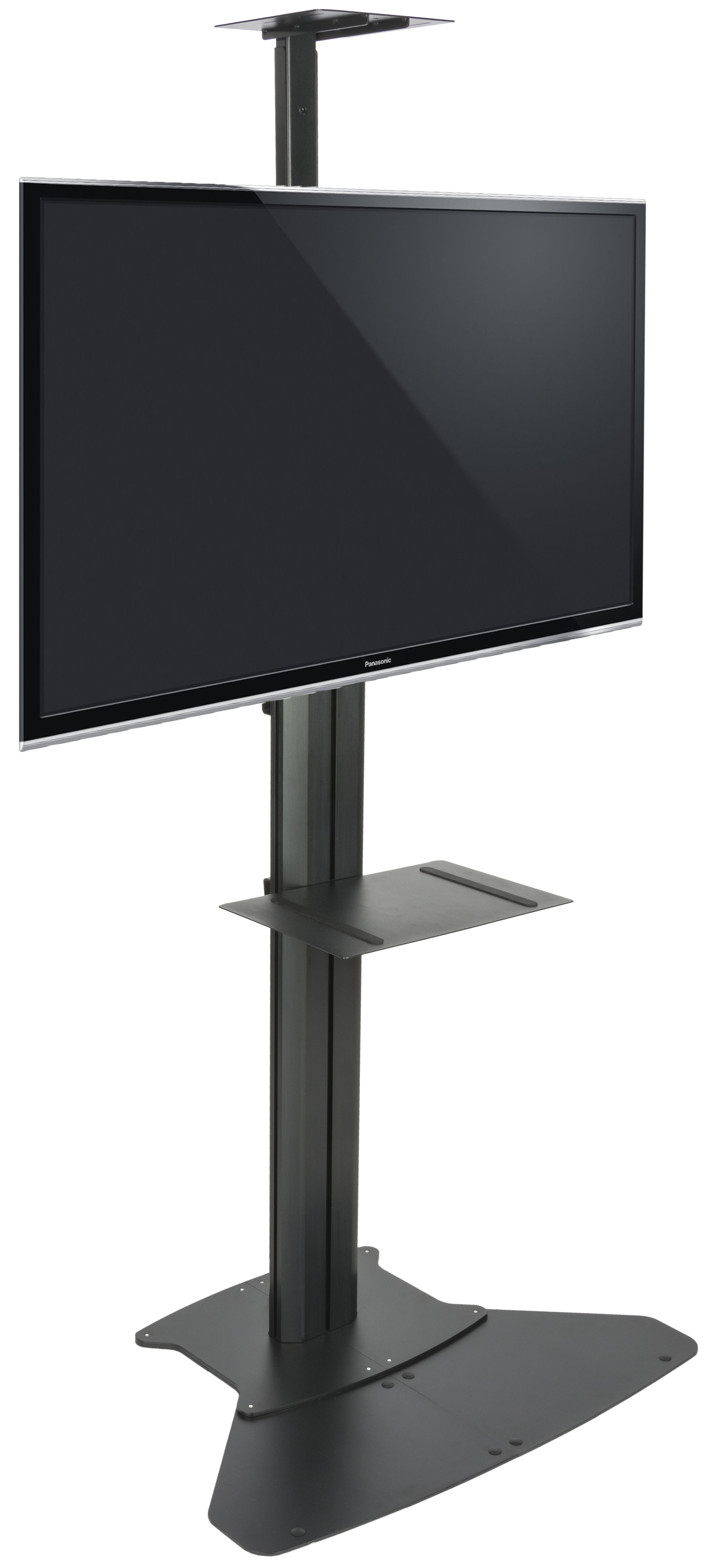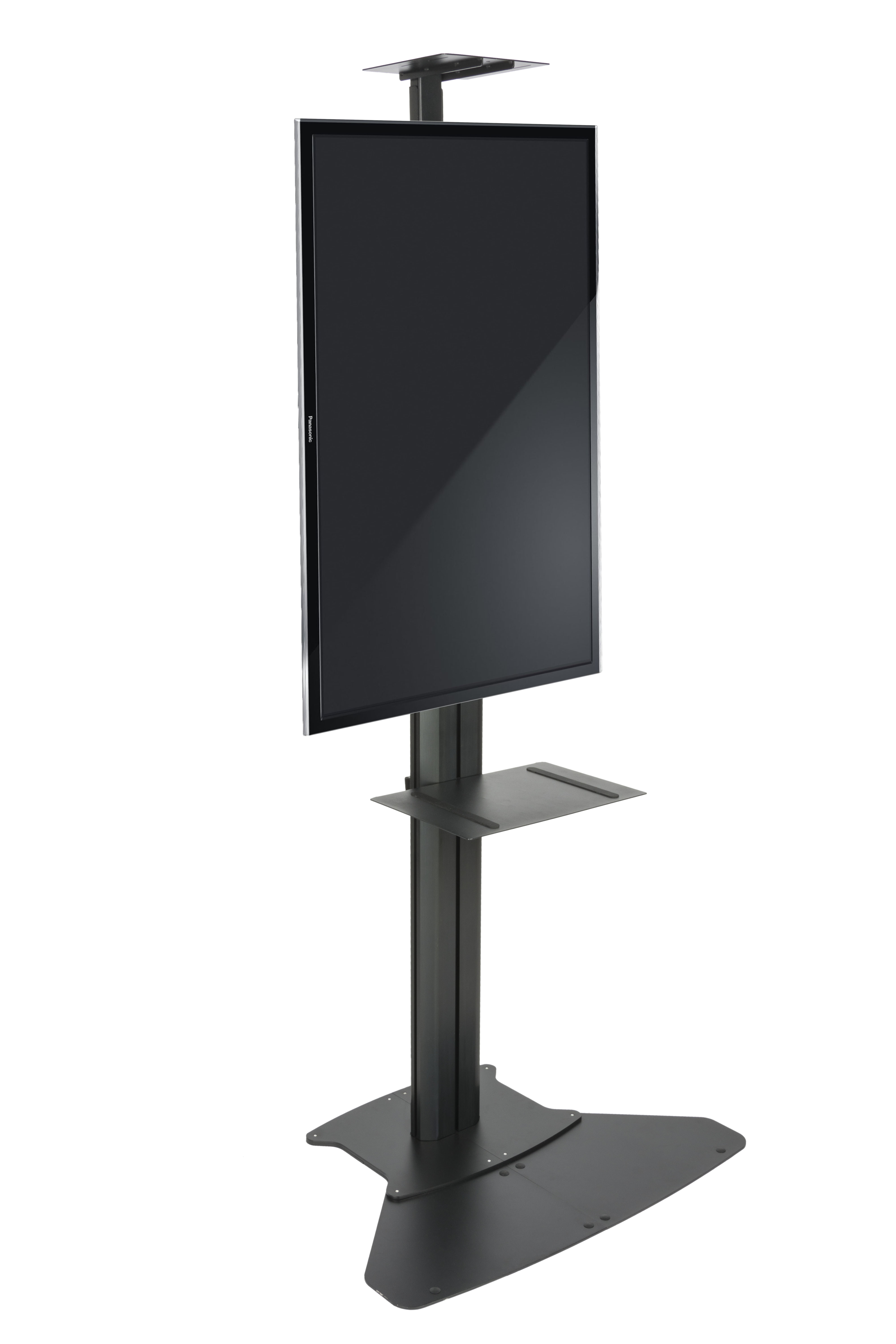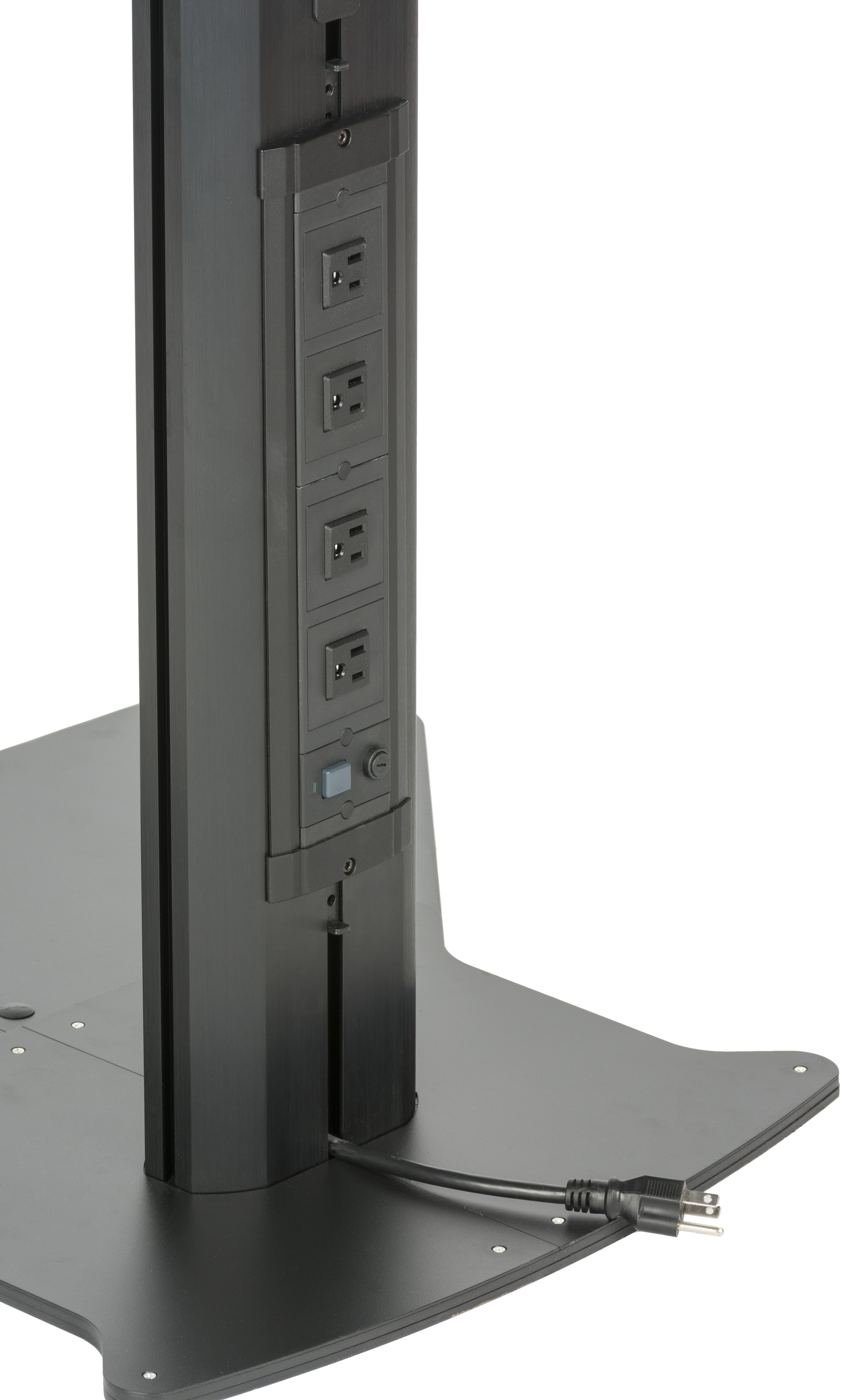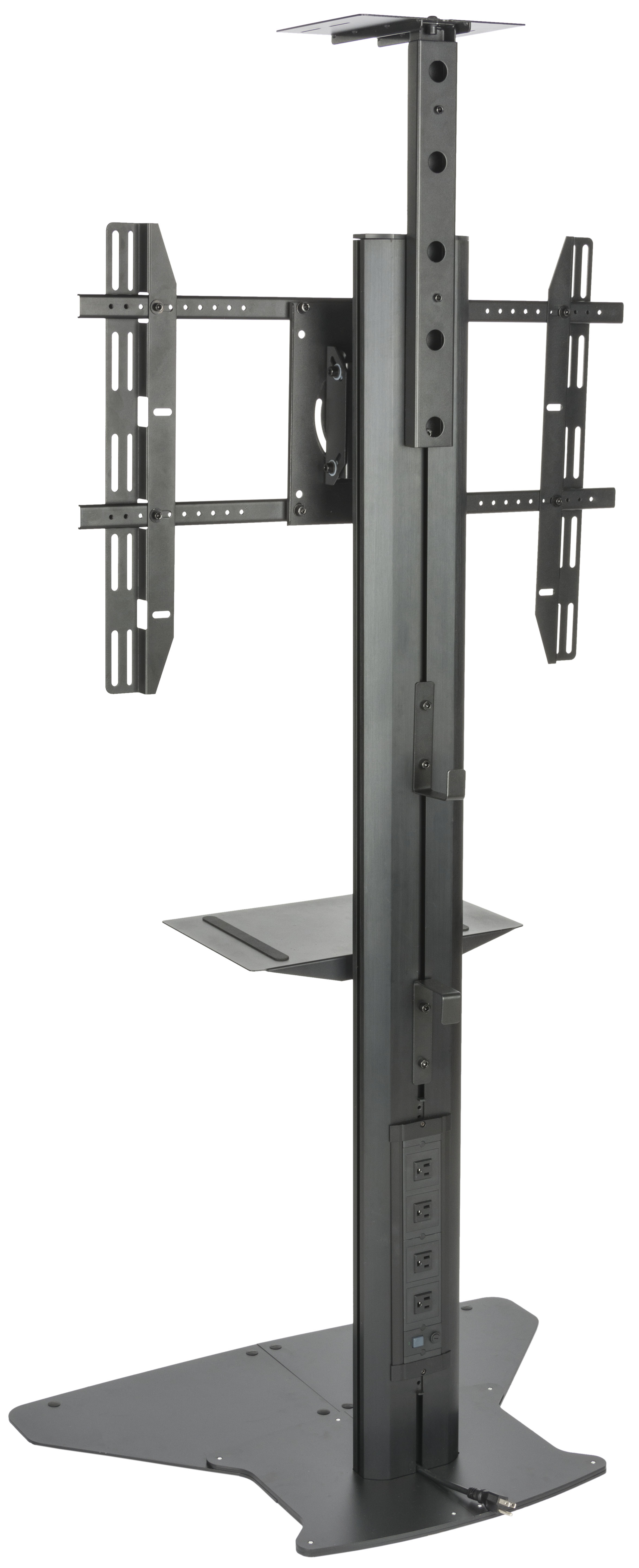 Capable of accommodating a 30”-84” flat panel weighing up to 132 lbs., this floor standing TV stand with power supply is perfect for high traffic areas. Security and stability are guaranteed with the included hardware to bolt each unit to the ground. Cable management is kept efficient and clean with the cord winder located on the back of the aluminum TV stand. Fit all your accessories, such as DVD players or laptops on the front shelf that can be adjusted to the height of your choosing. Mount your flat panel monitors in either portrait or landscape view for the best orientation to portray your message. Feature this TV stand at your store or business to present pertinent information or showcase your brand to passersby’s. Keep your electronic accessories charged with the cord management and outlet strip to maintain a professional looking mount.
