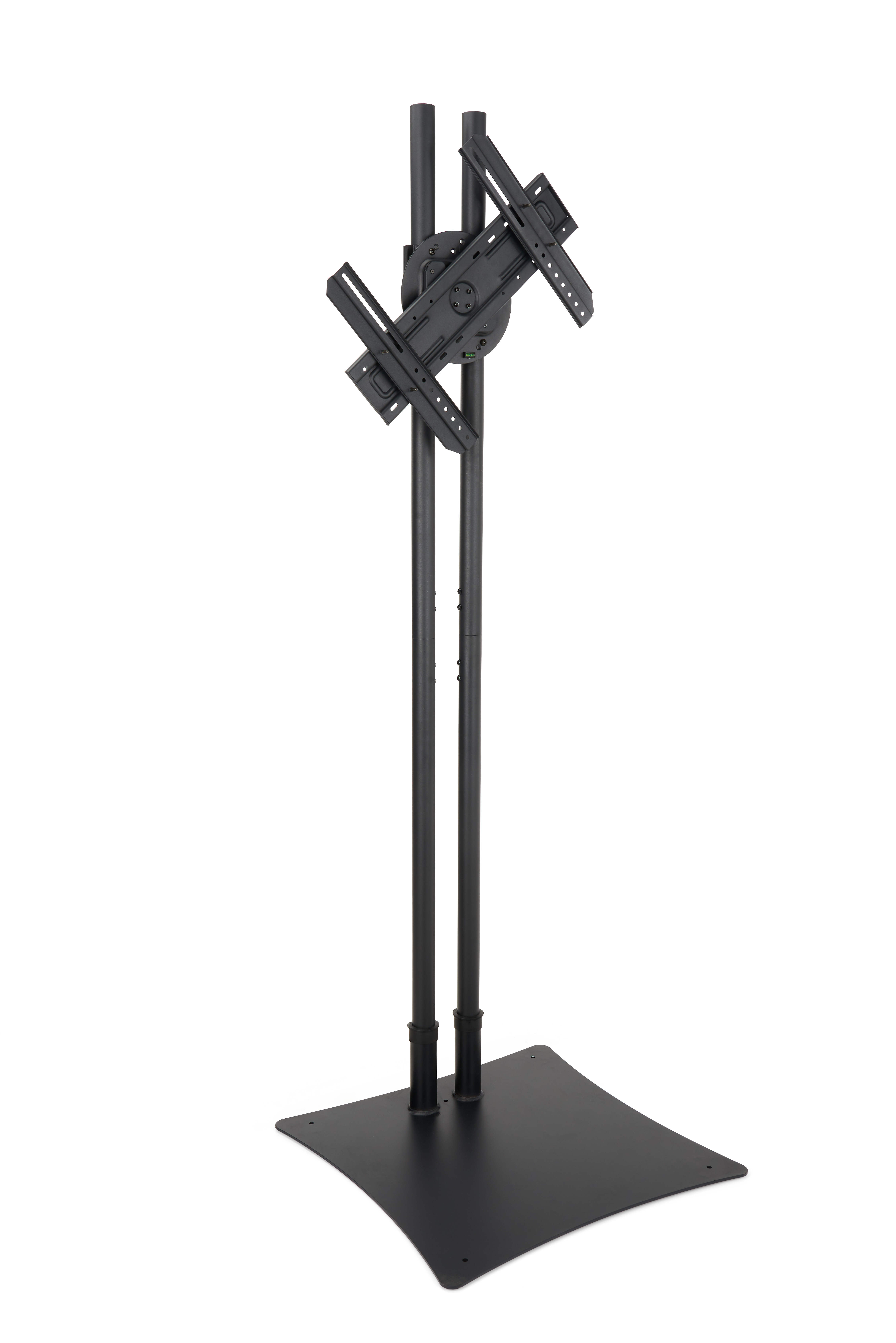 This exhibition TV stand fits 32” and 70” wide monitors with a max weight capacity of 110 lbs. The durable floor standing unit is constructed of steel and features built-in cable management to hide unsightly wires within the stand. The double pole design holds a sturdy bracket that rotates 360 degrees, designed for versatility, allowing you to turn your screen from portrait to landscape in seconds. This TV stand has a maximum VESA capability pattern of 600 x 400 to hold larger models. For added stability and security in public settings, the flat base also features mounting holes so that it can be easily bolted to the floor.