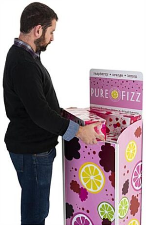 This spring-loaded custom retail beverage rack is an innovative display solution created to showcase your best inventory alongside full-color graphics within any retail environment. Our vertical case stacker comfortably enables products to be sold at the customer’s height, removing the need to bend over and lift heavier merchandise. Each retail beverage rack with calibrated spring-loaded base can hold a variety of stackable goods such as soda cans, water bottles, cases of wine, canned goods, energy drinks, and more! Made of durable powder-coated steel in a matte white finish, this unit supports up to 55 pounds of weight and can withstand the harsh conditions of shopping areas with high traffic. This retail beverage rack with vibrant UV printed personalized graphics has interchangeable branding capabilities for easy store or campaign changes when needed. Pair this vertical case stacker with your stackable goods for the perfect merchandising update to your brewery, winery, supermarket, or liquor store today!
