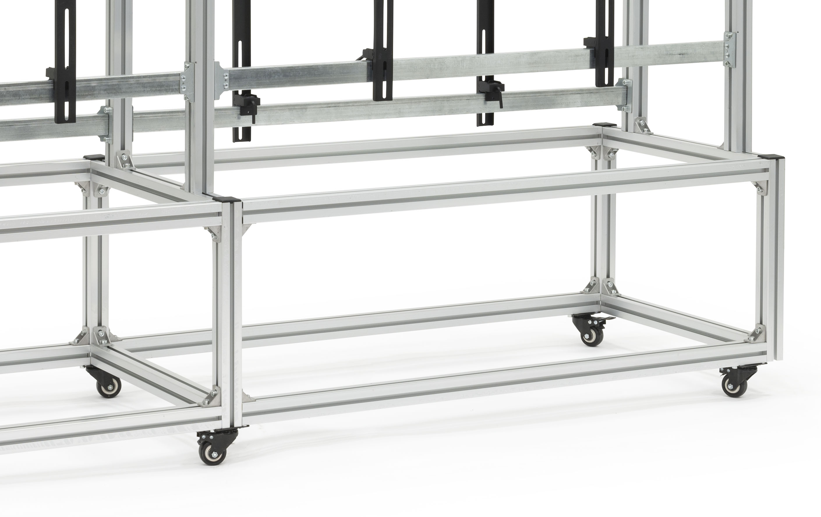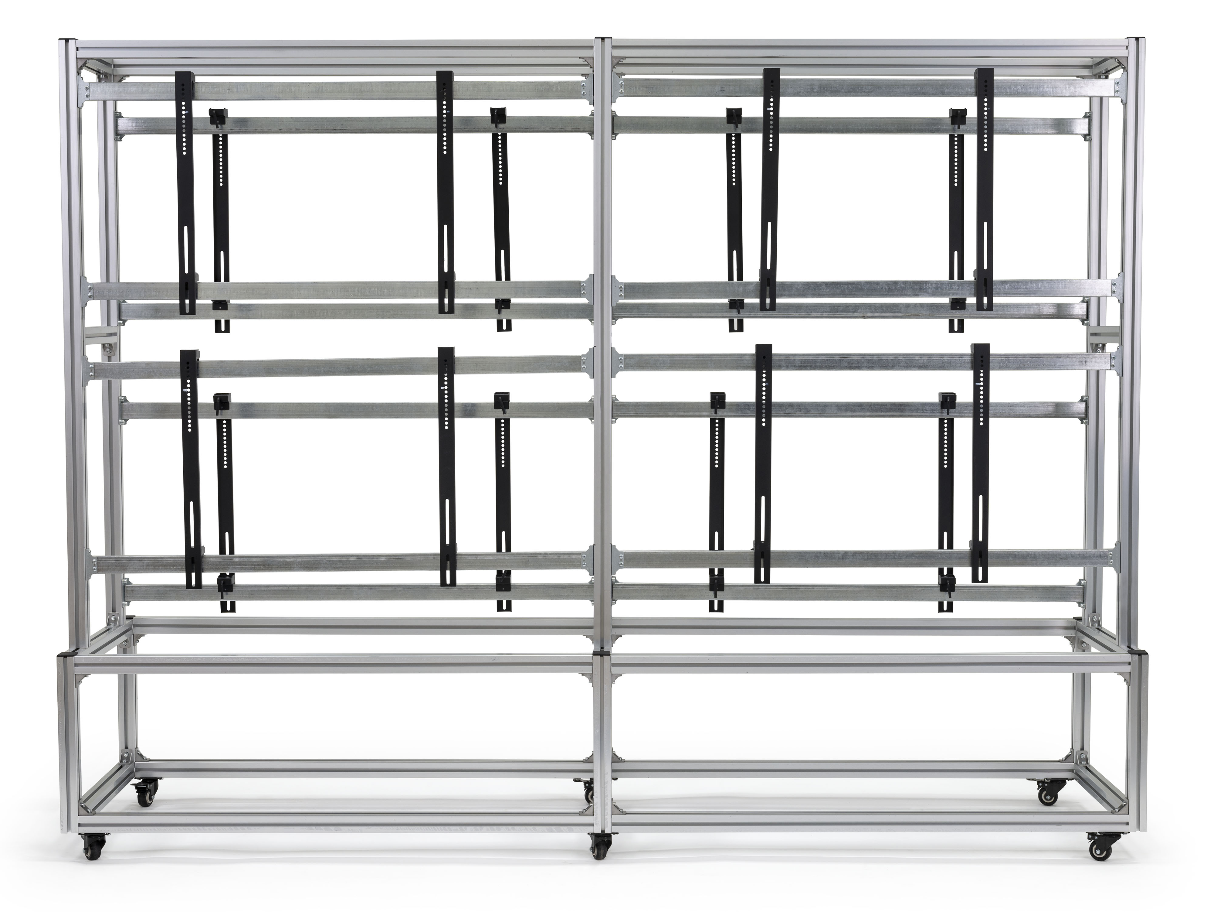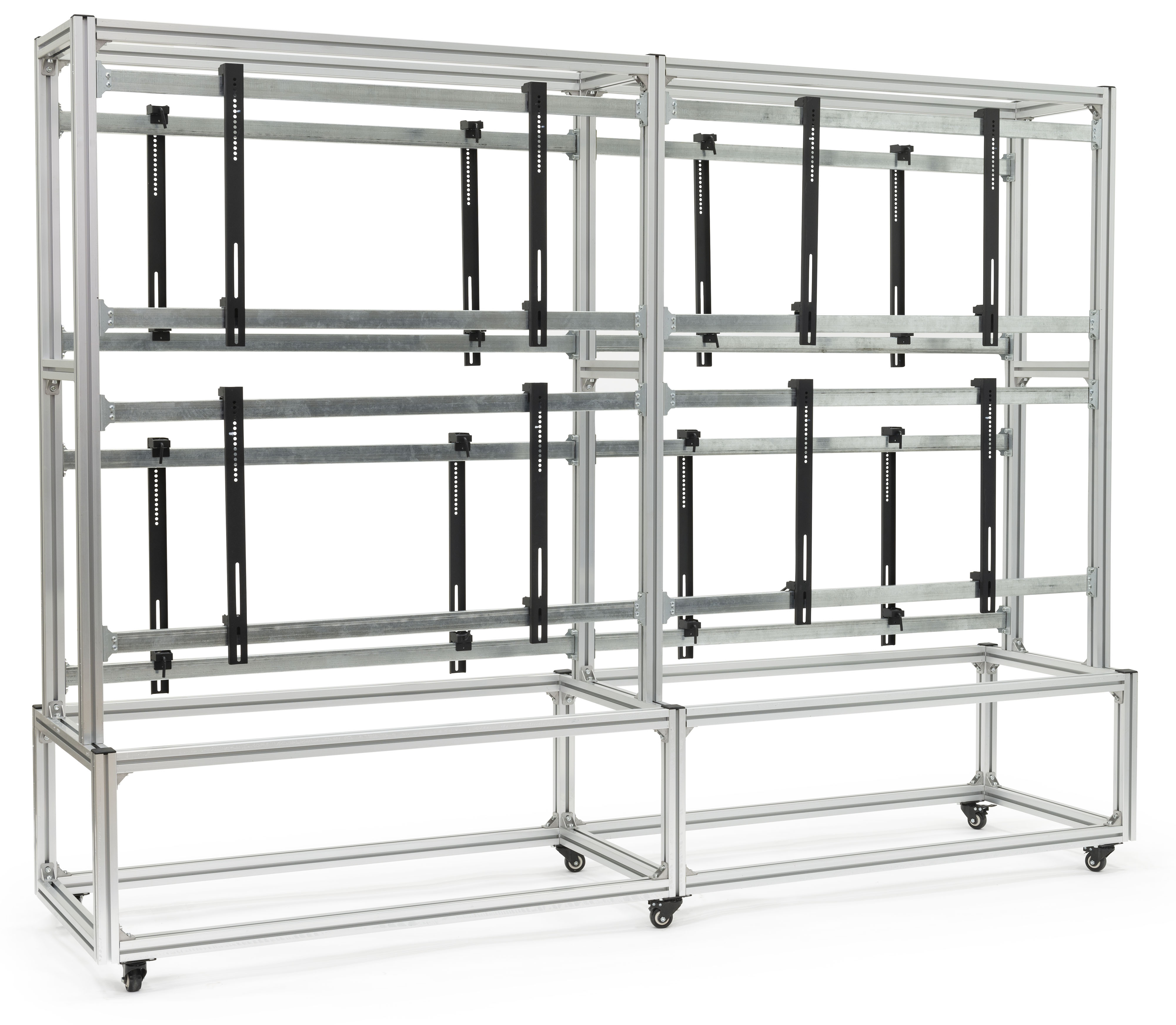 Video Wall Stand for (8) 49″ – 55″ TV Screens, Double-Sided, Wheels – Silver