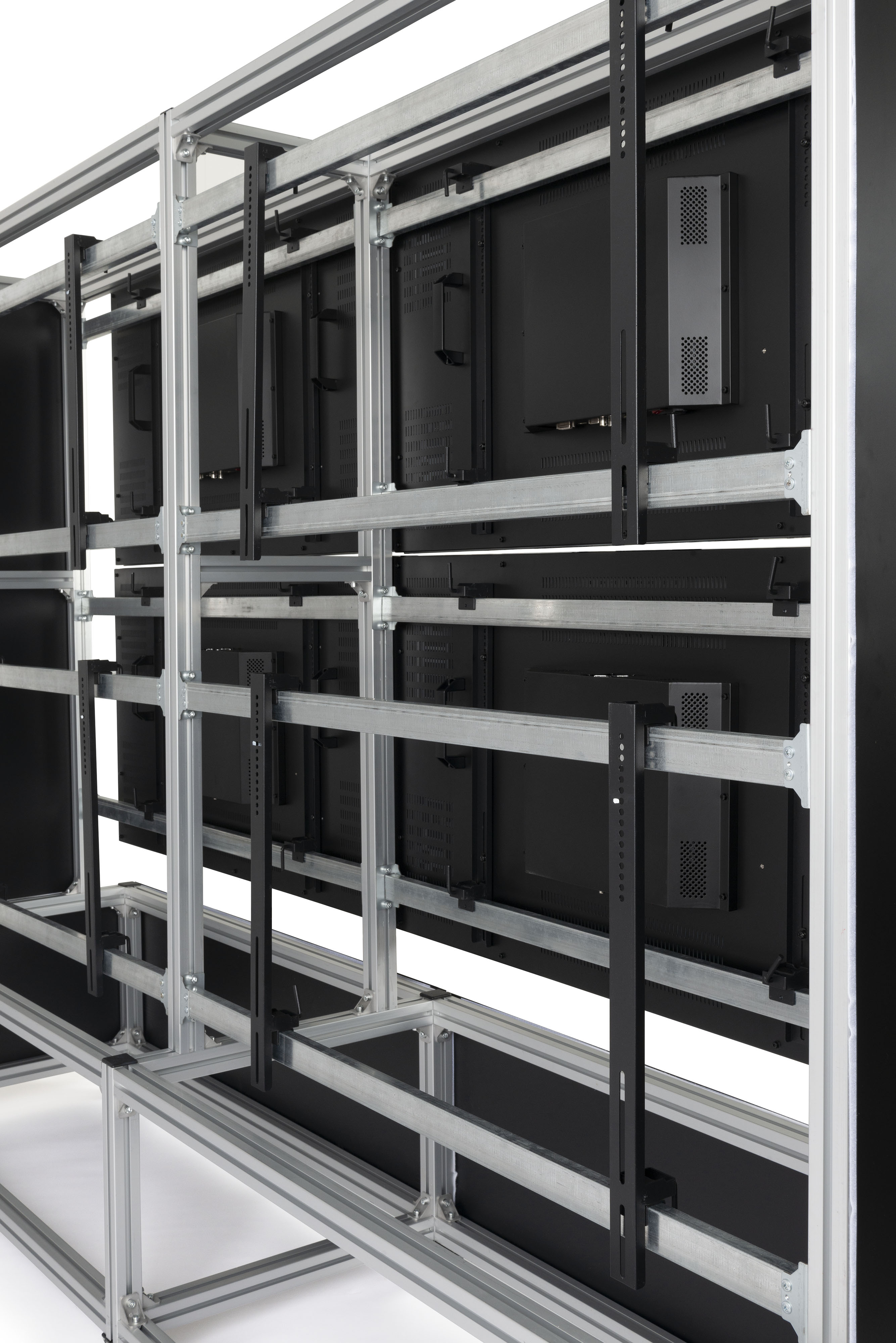 Our freestanding video wall mount is an exclusive design and a great way to showcase digital signage advertising messages at corporate offices, convention centers, college campuses, and more. Each mobile TV stand comes with six locking caster wheels, allowing users to move their unit around with ease and giving them the option to lock it firmly in place when needed. This 2×2 freestanding video wall mount can hold up to eight 49″ to 55″ digital signage monitors, giving customers the option to choose between a single or double-sided advertising display. This mobile TV stand’s overall dimensions are 71.00″ H x 95.62″ W, making for an eye-catching showcase in any lobby, office, hotel, or community center. Built from durable square aluminum alloy railings, you can feel confident knowing the monitor display offers heavy-duty support with a 615 lbs. maximum weight capacity. Our mobile freestanding video wall mount will enhance the way any business operates, whether you plan to showcase upcoming events, stock market analytics, maps of your building, and more!
