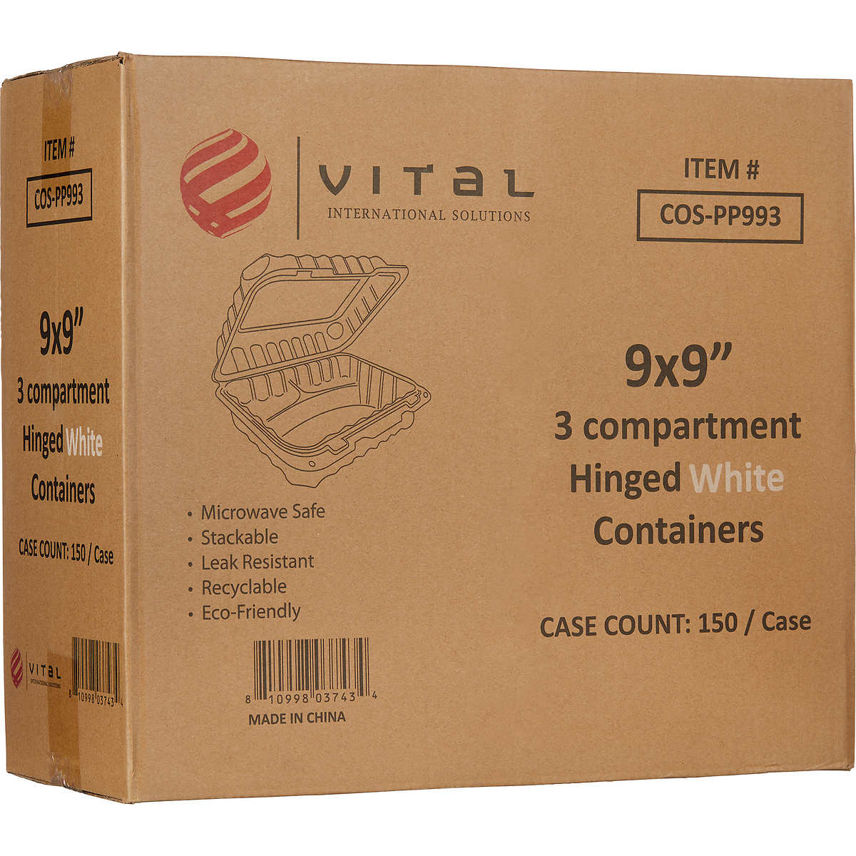 Vital International Solutions 3-Compartment Hinged Container, 9″ x 9″, 150 ct