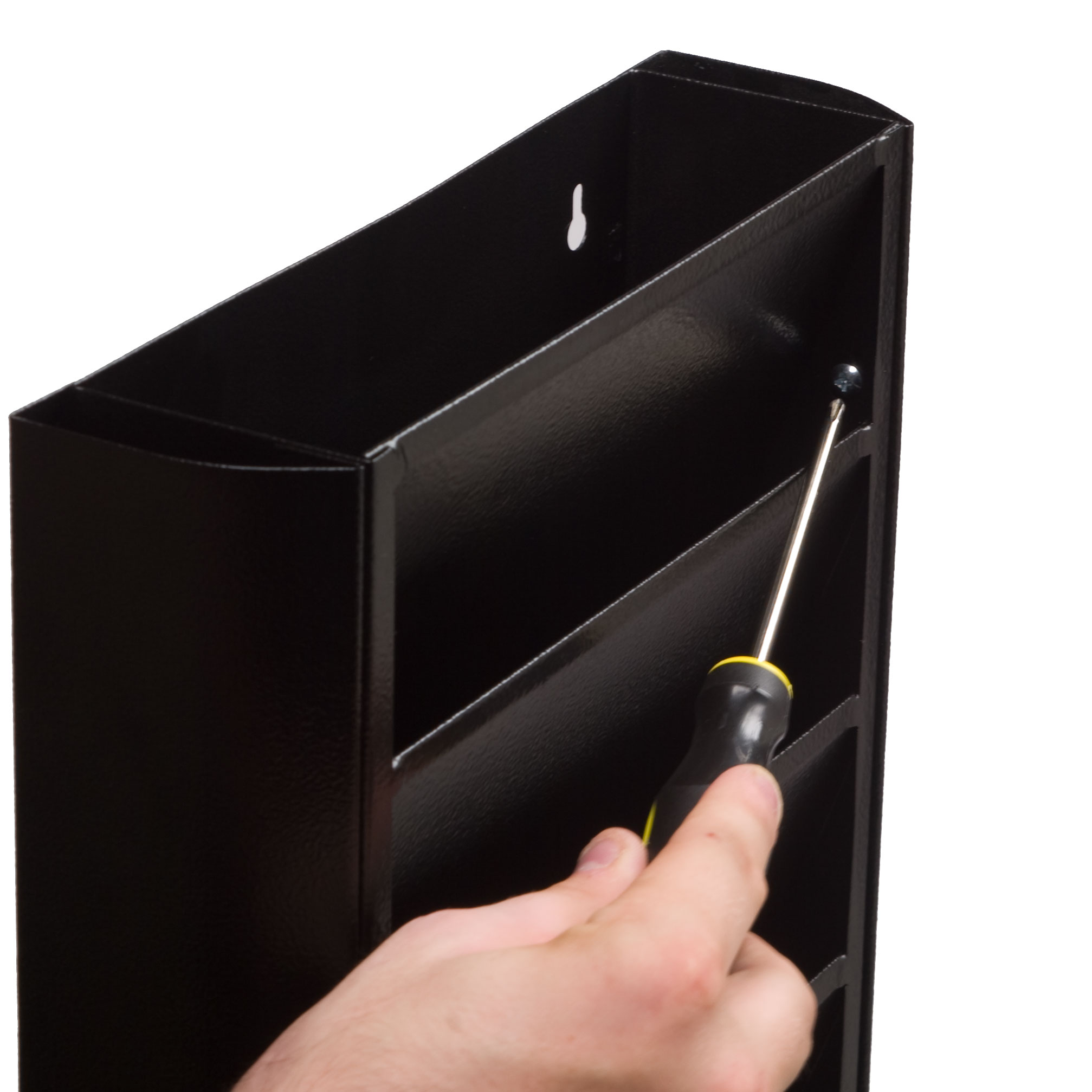 This wall magazine rack has (18) pockets to accommodate many magazines. Each pocket is spaced to allow ample room for the magazine covers to be shown. This wall literature holder is made of metal ready to withstand a lifetime of use. This wall magazine rack features a textured black finish, to fit in with a variety of settings. Our mounted catalog holder is the perfect wall magazine rack for use in doctor’s offices, hospital waiting lounges, and other reception areas. Each literature holder features two endcaps, one on each side of the display. These endcaps can be taken off to combine multiple displays into one unit, with the endcaps helping to create one seamless wall mounted display. With two pre-drilled holes to mount the magazine rack on a wall, this display can be easily hung on any wall within minutes!