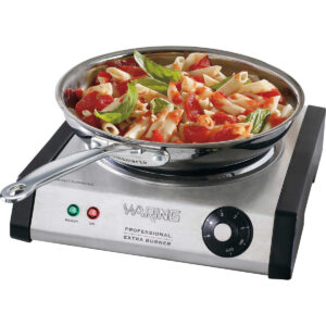 The Waring WEB300 Commercial Cast-Iron Single Burner offers a heavy-duty, portable solution for your omelette, catering or buffet stations. A 1300 watt heating element heats up the 7″ cast-iron burner plate quickly and evenly. Non-slip rubber feet keep the burner stable, while the adjustable thermostat with ON and READY indicator lights alert you when it reaches the desired temperature.