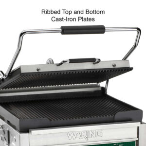 - Ribbed cast-iron plates for even heat distribution and quick cooking time