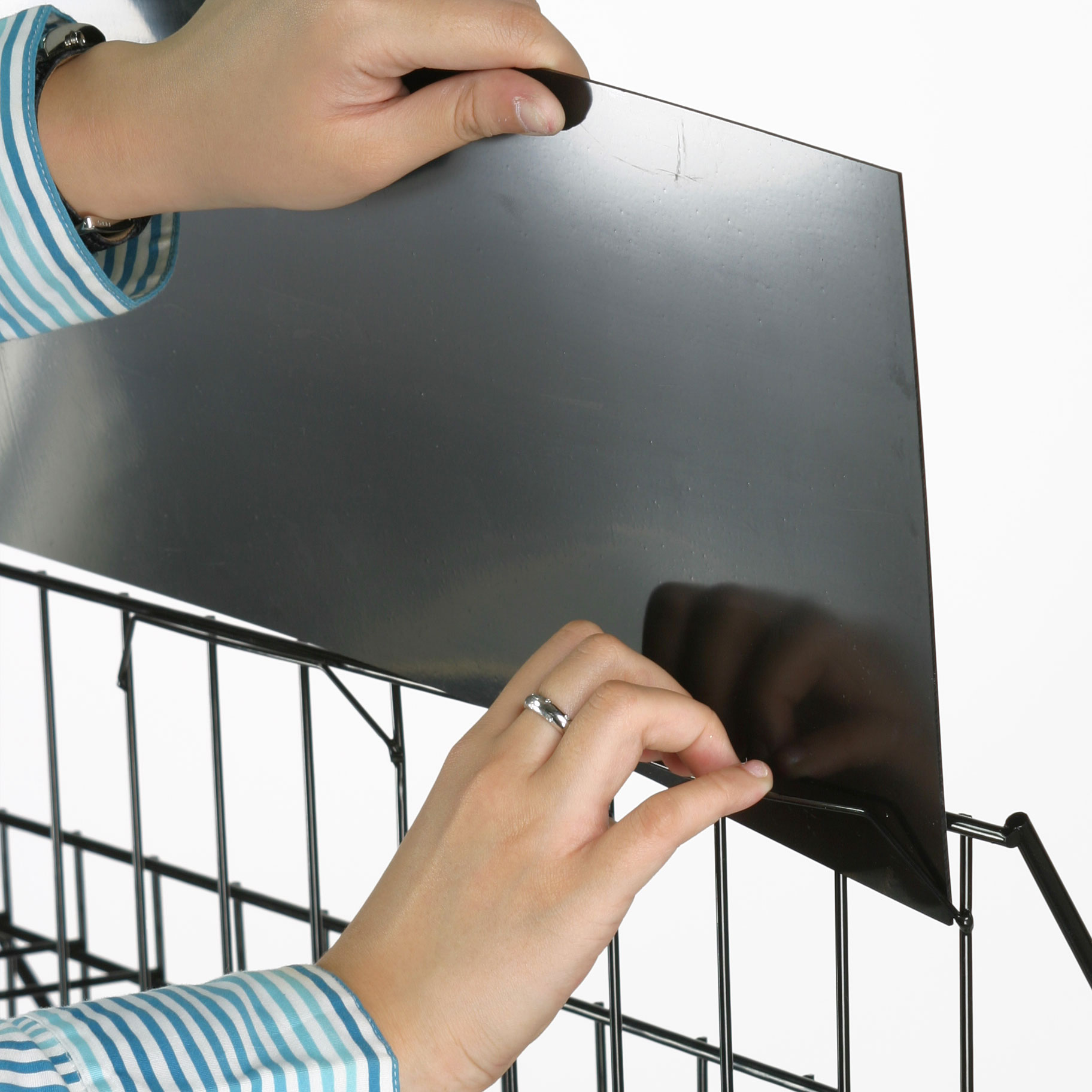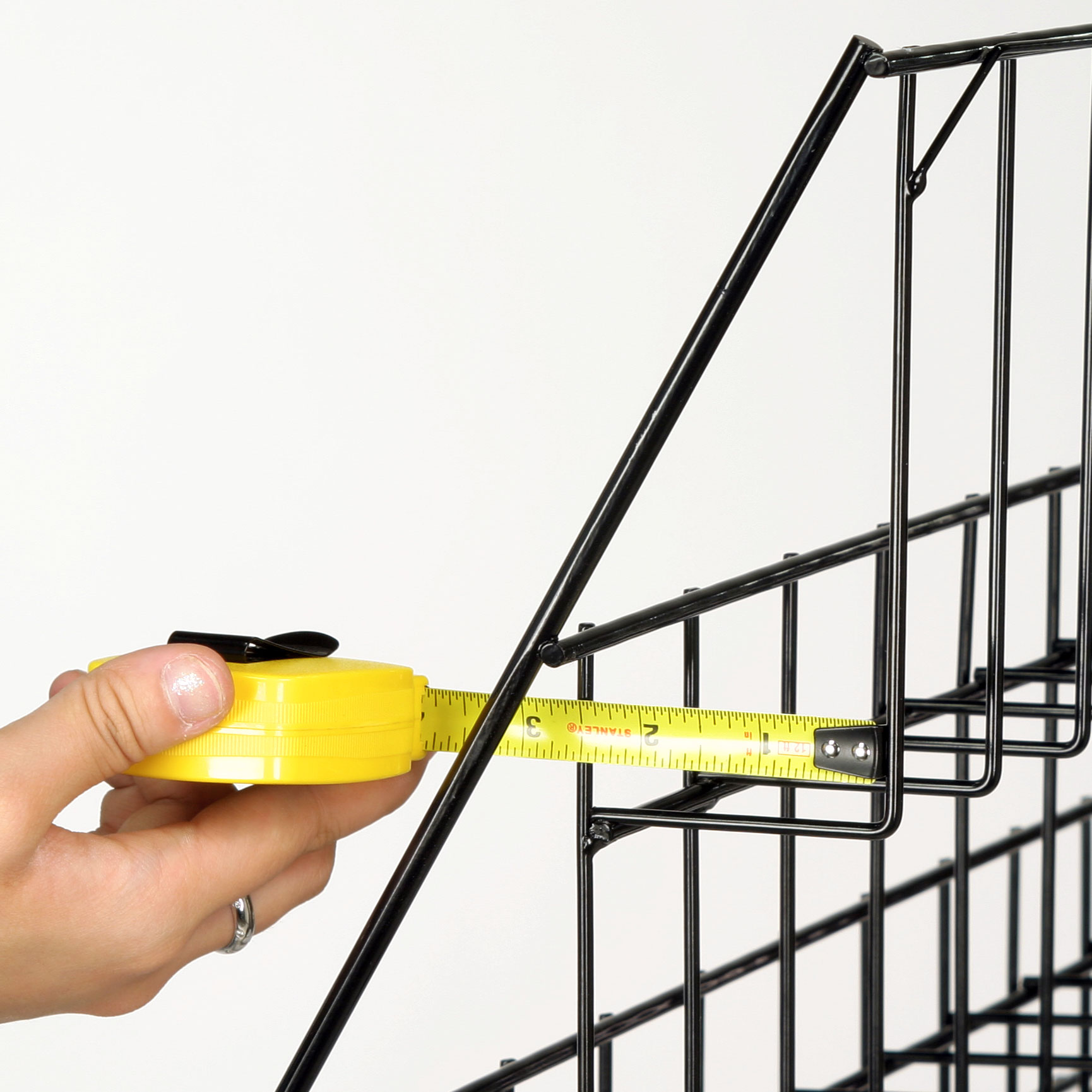 This wire display enhances point of purchase sales. Durable and cost-effective, the tall display rack captures customer attention. This wire display, also known as a display stand, organizes and promotes your merchandise. The design encourages customer browsing and selection of publications. This wire display is an open shelf design. There are 10 rows with 27″ wide pockets for displaying a variety of items. This retail rack can be used to promote books, magazines, CD’s or other merchandise that fits into the 2-1/2″ deep pockets. Finished in gloss black, this wire stand fits almost any decor. A sign slot is provided at the top of the wire rack for insertion of your signage (sign not included). The “Financial Information” sign pictured is only an example of what your sign might look like. Portable, this wire rack can be folded for easy storage. It takes less than a minute to assemble.