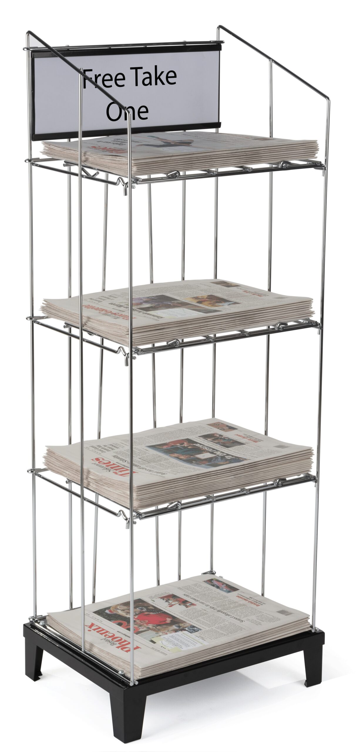 Once you use this versatile display, you’ll never want anything else! Its durable all metal construction will last for years. This unit takes up a relatively small footprint, but is capable of holding 90 daily newspapers or tabloids. The frame and removable shelves are made of sturdy wire that will withstand the heavy weight of papers without bending. The shelves have hooks in the back that allow you to slide them over the support bar. The frame attaches to a black metal base with provided hardware that helps to elevate the papers to customer eye level. Also, at the top of this indoor display there is a black metal panel with channels. Leave it blank or insert a 16″ wide x 6-1/8″ high sign with the name of the newspaper or tabloid.