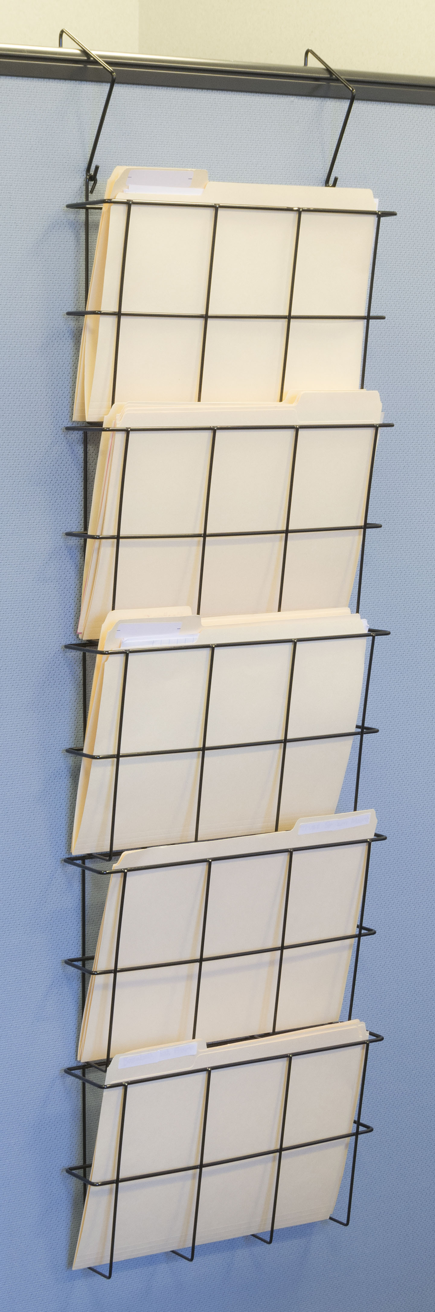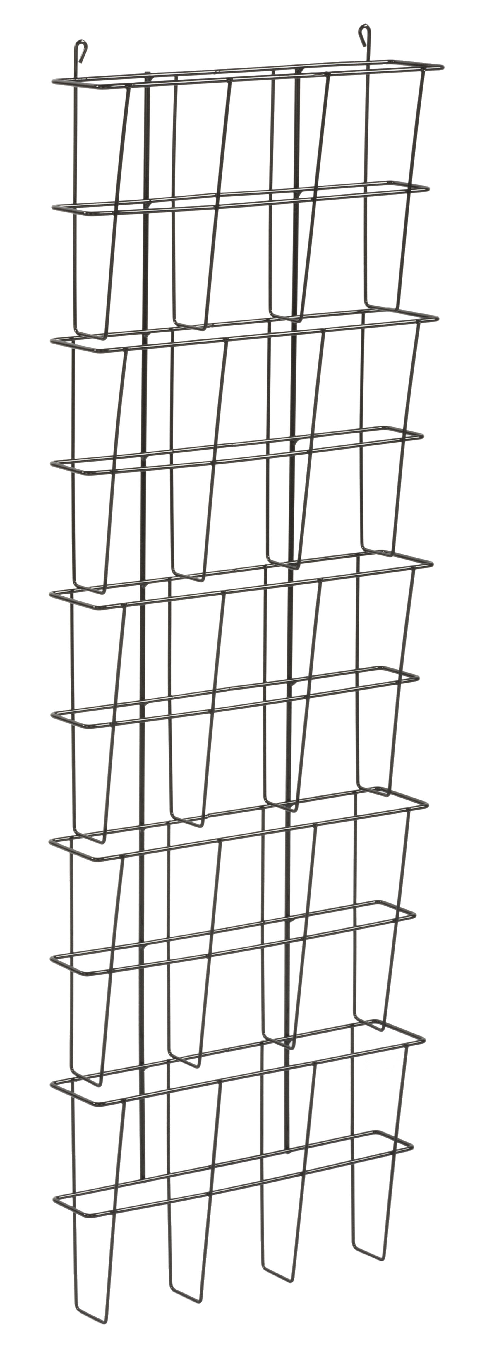 This wire wall pocket organizer is the ideal solution for quickly sorting files and literature. The metal design is capable of holding letter size folders and magazines up to 13”w x 9.5”h. Each wall organizer for office environments includes hooks to easily hang over your cubicle. The frame also mounts for a more permanent solution that will stay in place with heavy use. Use the wall organizer to hold up to 5 stacks of letter size files or literature. The metal build and jet black powder finish look neat and tidy when you mount or hang the rack from a cubicle.
