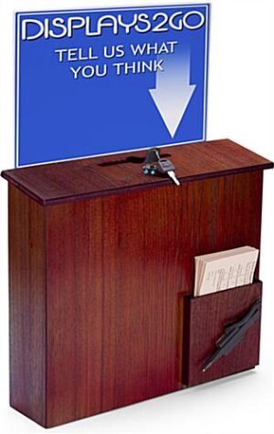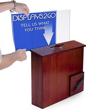 The comment box with sign holder is a great way to get people involved using suggestion cards! Start collection entries, registrations, and donations inside the 15”w x 4.5”d display by slipping papers into the 5”w x .5”d insert pocket. Empty the ballot box by unlocking the lid that is hinged using the set of 2 keys. This display can either be wall mounted using the included hardware, or can be left on a counter or tabletop. Featured on the outside of the box is a suggestion card pocket and a pen grip to keep things neat, organized, and ready to use. Each ballot bin ships fully assembled with the exception of attaching the optional clear acrylic header.