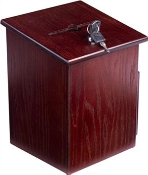 Wood suggestion boxes, also known as a collection box, can be used by offices as a suggestion box, or as a charity box for a local organization. The comment boxes feature a security pen. A security pen has a chain attached, conveniently attaching to the side of the box and providing visitors with instant access to a writing implement. These employee idea boxes have a red mahogany finish, easily fitting in with any environment. Comment boxes have a pocket to hold forms to write on, such as cards for suggestions in the pictures.