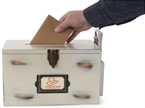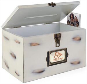 This wooden wedding card box measures 14.29″ wide, providing ample space to house envelopes, forms, donations, and more into each decorative display. Ideal for any occasion, from bridal showers to charity events, this lockable pinewood gift holder is designed to be durable without compromising style. Each distressed wedding card box has an easily accessible top insert opening and hinged lid with lockable metal latch closure to prevent unwanted tampering and theft. Store pamphlets, brochures, and blank forms in the 4.25″ wide side literature pocket on this display to keep donation or event information readily available for guests. This wedding card box with distressed finish features a signage frame on the front of each unit to create a personalized showcase that allows you to easily change your graphics and messaging for multiple occasions. Whether utilized to collect donations, money, or tickets, this lockable gift holder has the versatility and ease of use to fit any need!