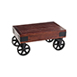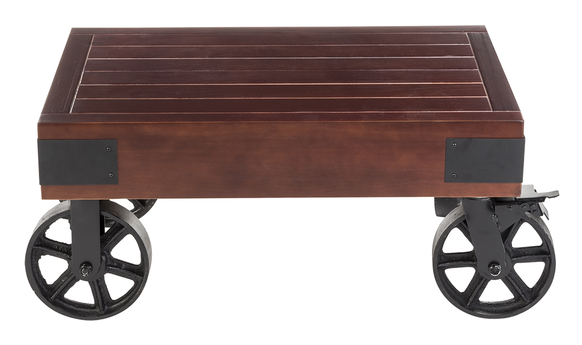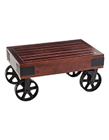 Use this industrial style low wheeled table as a modern rustic residential or commercial fixture. Offering versatility, the steampunk-inspired cart provides a well-crafted furniture piece. Mahogany wood adds to the modern rustic design of each vintage low wheeled table. Effortlessly maneuver the steampunk-inspired cart with the help of 4 oversized flat tread iron casters. Once in place, lock the 2 brakes for a stationary residential or commercial fixture. Pair the low wheeled table with other furniture to create a modern rustic atmosphere!