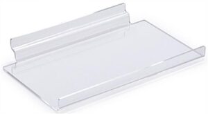 This slat wall shelving, also known as a slotwall shelf, is fabricated from clear acrylic. The clear acrylic allows your products to stand out. This slat wall shelving features a 1/2″h front lip. The lip prevents objects from sliding off the shelf. This is a great exhibitor supply for gift shops, collectible shops or retail stores. Slat wall shelving is a effective way to promote your products.