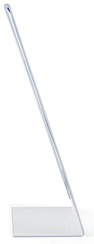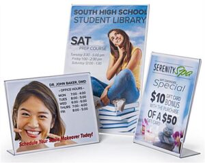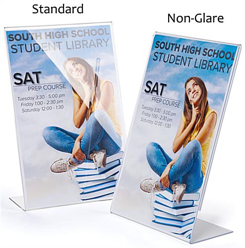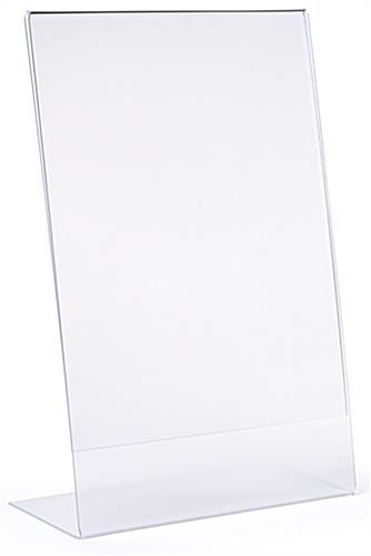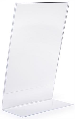 Drive sales with this anti glare plastic slanted display frame that allows you to easily display branding messages, marketing or sales information. This acrylic non-glare angled sign holder can be placed on any table top, countertop or desk to promote customer-facing material. This easy-insert plastic slanted display frame also serves as the perfect picture frame for that special occasion or event. The uses are limitless. These simple enclosures help eliminate glaring reflections from informational displays in brightly lit business office or trade show booths without reducing visibility. Allow your customers to think more positively about your products when you utilize this versatile acrylic picture setting to convey your daily/weekly/monthly specials or message. Add this eye catching large 11” x 17” size slanted display frames to help draw in the attention of your patrons for that successful marketing campaign.