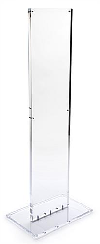 Style a lobby or store entrance with an indoor acrylic custom floor totem stand including a full panel graphic. Each clear display is a sleek sign holder designed for advertising or wayfinding purposes. Slide the double-sided graphic between the acrylic custom floor totem stand uprights with button magnets. Personalize the standing display with full-color designs printed using UV application. A heavy base and solid panels make for a durable sign holder in highly trafficked areas. Show advertising or wayfinding designs from both directions with a floor totem stand.