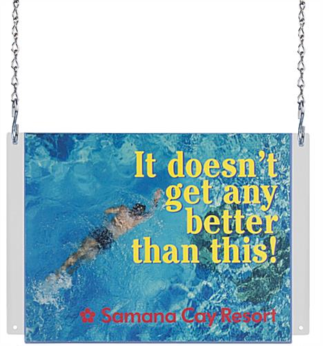 These suspended signs that link together allow businesses to create custom arrangements of poster holders. This set comes with (1) acrylic frame and a set of hanging hardware. Suspended signs with mounting brackets are compatible with frames the same size, allowing users to connect as many poster holders as needed. Reference the list of accessories below for frames that are compatible with this unit. These poster holders are suspended signs that are made from acrylic. The acrylic panel used to construct the frame is 1/8″ thick and completely clear. These suspended signs for windows are much more affordable than similar products made from aluminum or wood. Additionally, these signage holders are relatively easy to hang from the ceiling when compared to other units. Users top-load posters into these suspended signs that are affordable. (2) Prints can be loaded back-to-back into the frame, making these signage suspension systems perfect for windows facing a showroom floor.