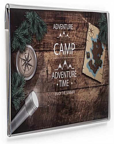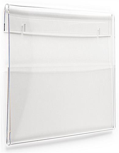 This sign display is made of clear acrylic with polished edges. They hold paper that measures 14″w x 8.5″h. Your paper slides in through the side of this display. Double-sided tape pads are also included for mounting this fixture to the wall.