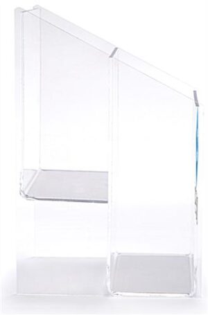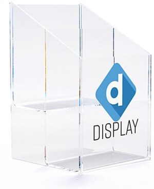 Use this custom printed plastic countertop booklet holder as a flyer dispenser for 5.5”w x 8.5”h literature. The acrylic display features a 2-tiered multi-pocket design with your personalized logo or logo on the front and side panels. Place the transparent plastic countertop booklet holder in any reception area, trade show booth or common space to easily distribute 5.5”w x 8.5”h literature to your guests. Upload your personalized graphics to transform the acrylic flyer dispenser into a branded display. The multi-pocket design allows you to easily organize and distribute two different types of leaflets. This plastic countertop booklet holder is ideal for any reception area!