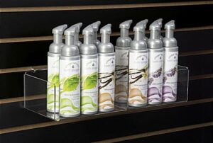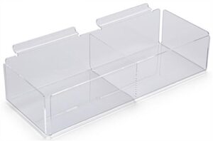 Acrylic bins and other slatwall accessories are a great way to build customized store fixtures at a low cost. Measuring 16 ½”w x 6 ¼”d x 3 ¾”h, this slatwall bin is designed to fit into all of our slatwall panels and displays. Because these slatwall bins attach to the slatwall without any tools or mounting materials, setting up your display is easy! Just insert the attached hooks into your slatwall panels and fill with products! These slatwall bins are ideal for holding samples, candy, travel products, and other small, loose merchandise. With two separate bins side-by-side, you can hold different products without them mixing together. Each individual compartment is 8 ¼” wide.